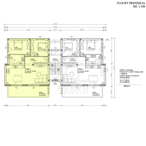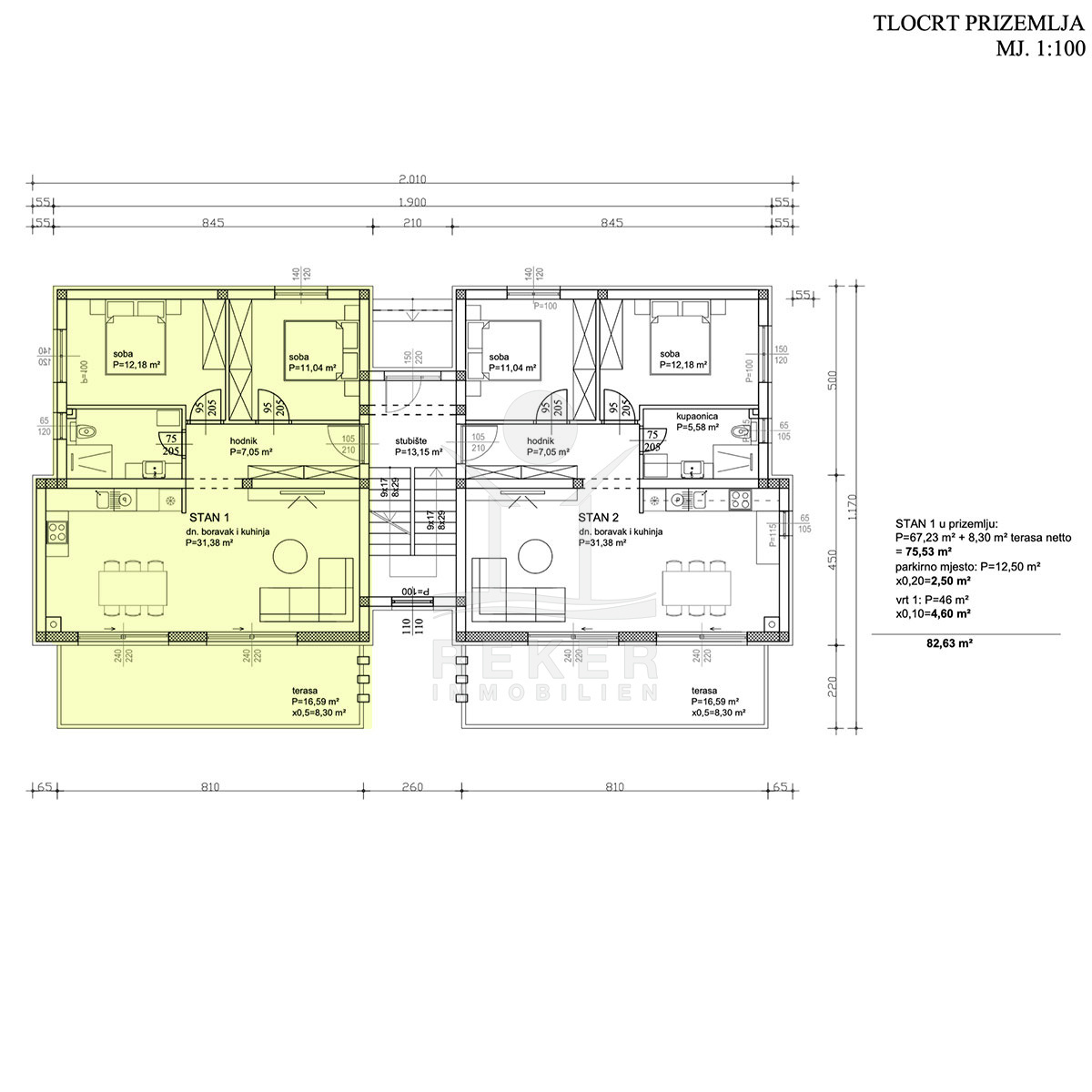 Die Wohnung im Erdgeschoss links bietet eine Wohnfläche von 67,23 m² und überzeugt mit klarer, funktionaler Raumaufteilung. Der offene Wohnbereich bildet den Mittelpunkt und verbindet Kochen, Essen und Wohnen auf einer Ebene. Zwei Schlafzimmer und ein Bad mit Fußbodenheizung ergänzen den Innenraum. Hochwertige Marazzi-Keramik, maßgefertigte Innenausbauten sowie wärmegedämmte Aluminiumfenster mit Dreifachverglasung betonen den hohen Ausstattungsstandard. Für ein angenehmes Raumklima sorgen Daikin-Inverter-Klimaanlagen in allen Räumen. Sicherheit gewährleisten eine einbruchsichere Eingangstür und eine Video-Türsprechanlage. Elektrische Rollläden unterstreichen den modernen Komfort.