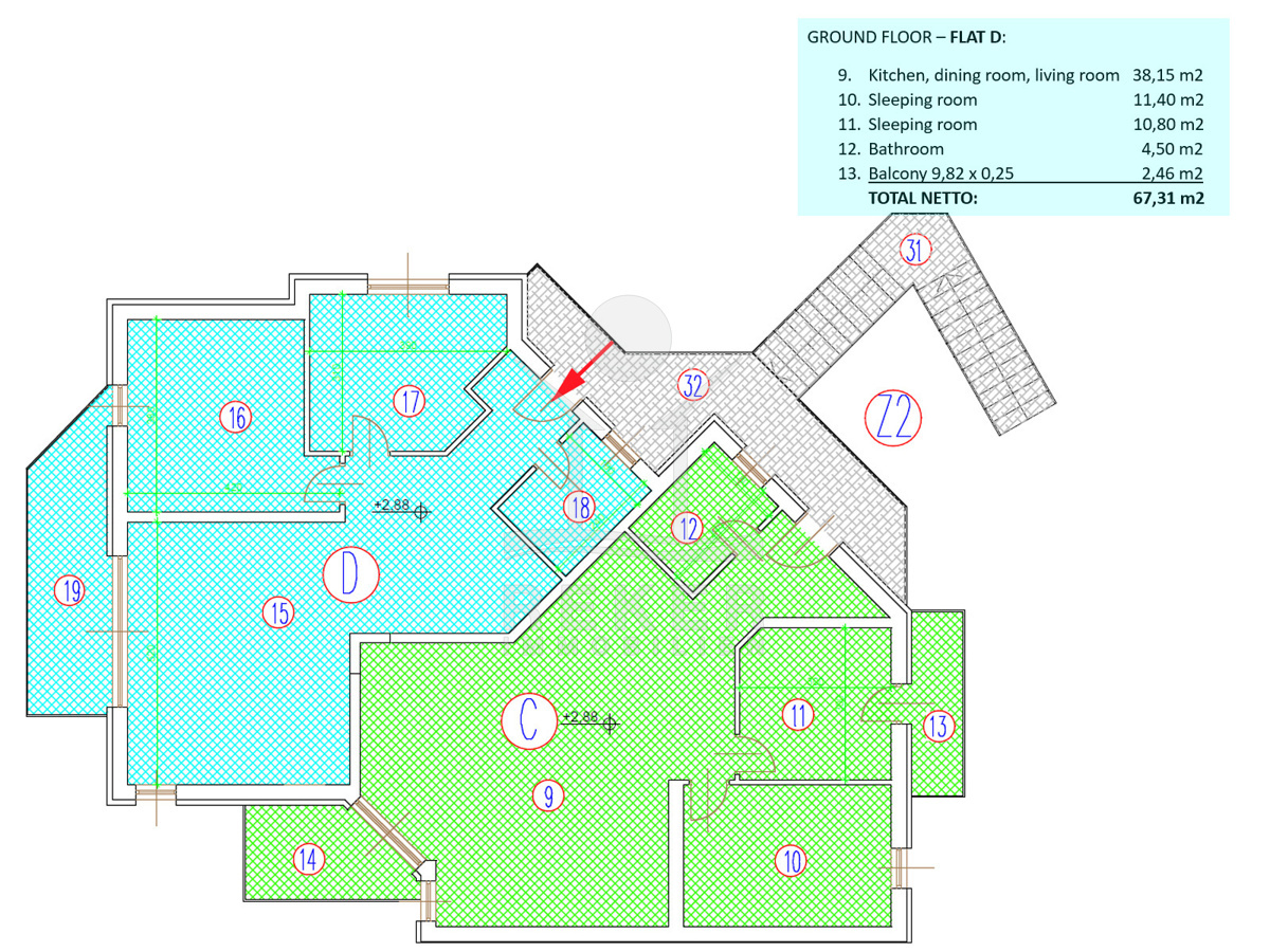 Die Wohnung verfügt über einen durchdachten Grundriss mit einer Wohnfläche von 67 m². Beim Betreten erwartet Sie ein einladender Eingangsbereich, der zum offenen Wohn-, Ess- und Küchenzimmer führt. Von hier aus gelangen Sie auf einen großzügigen Balkon mit 9,82 m², ideal für die Freizeit im Freien. Die Immonilie umfasst auch zwei gemütliche Schlafzimmer und ein Badezimmer, die für angenehme Nachtruhe und persönlichen Komfort sorgen.