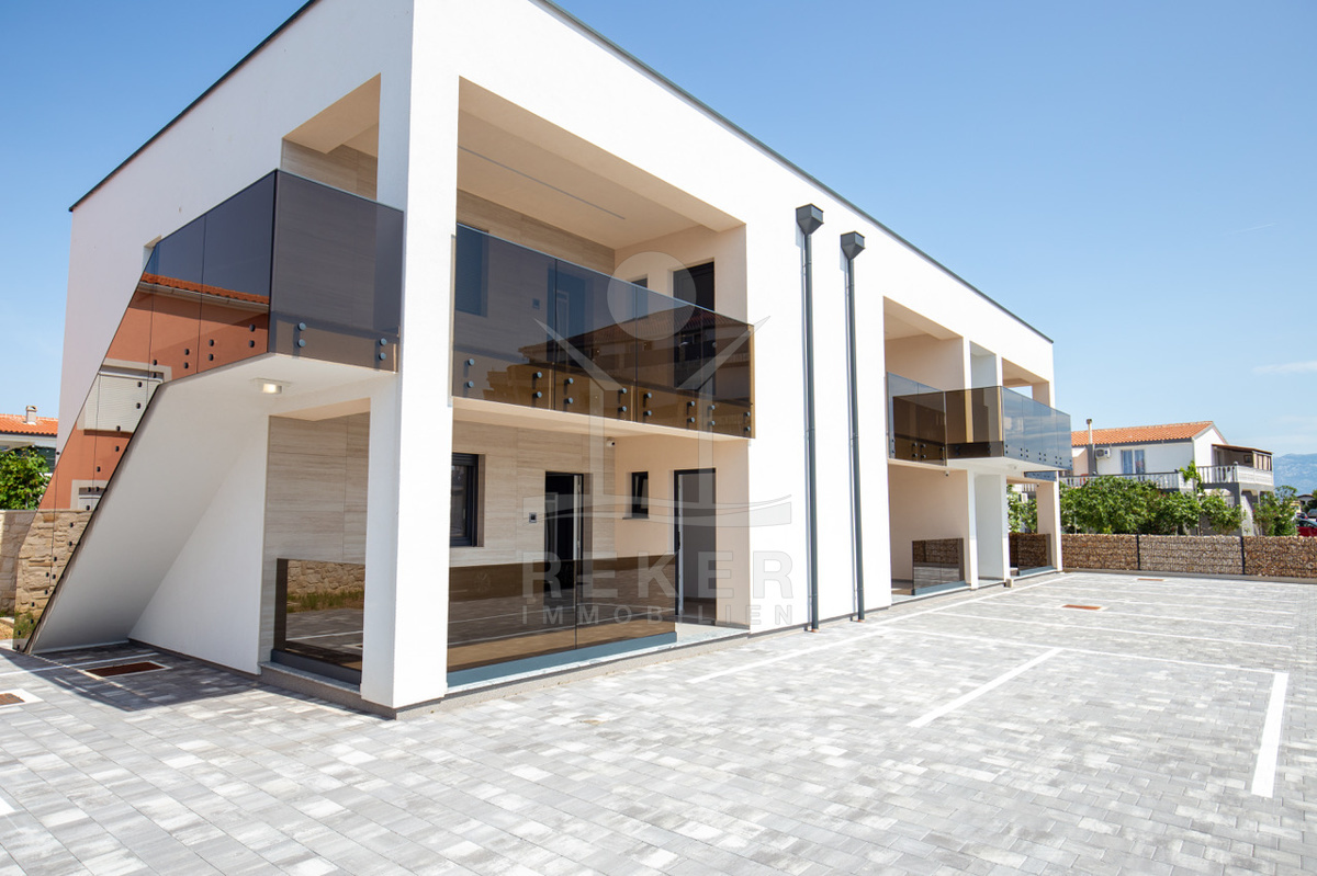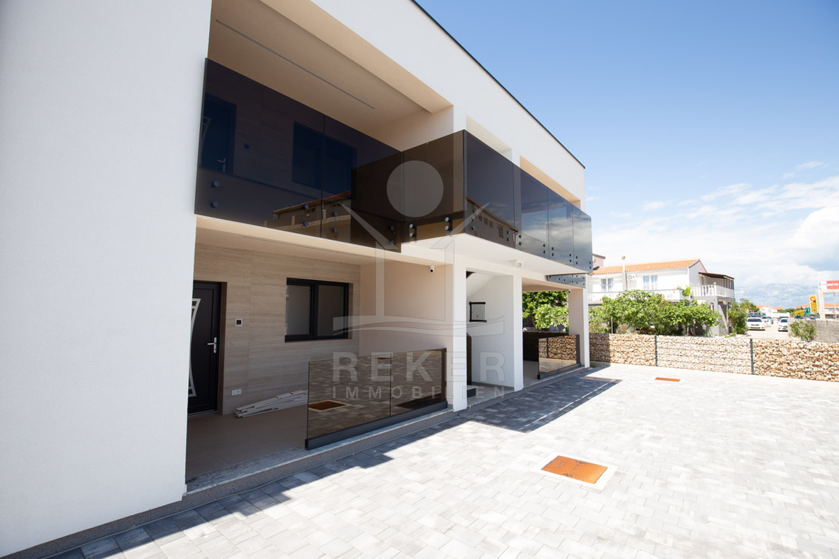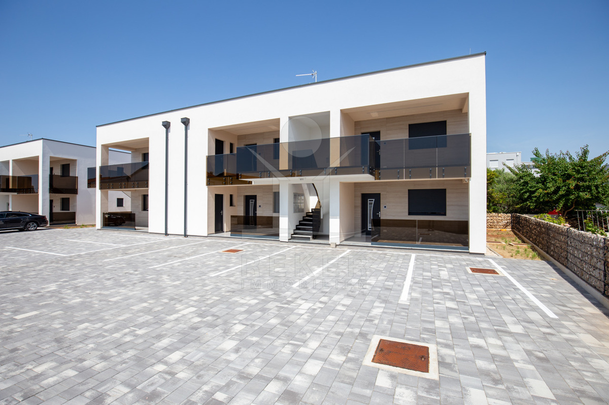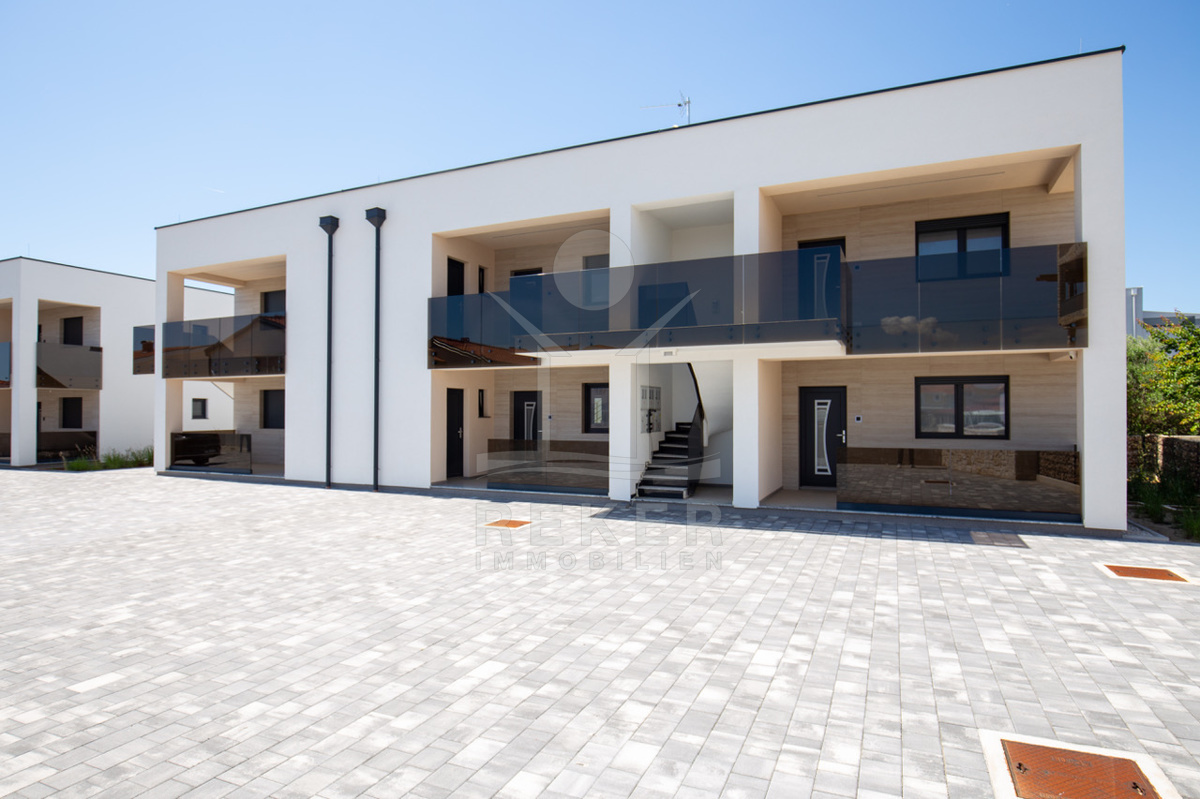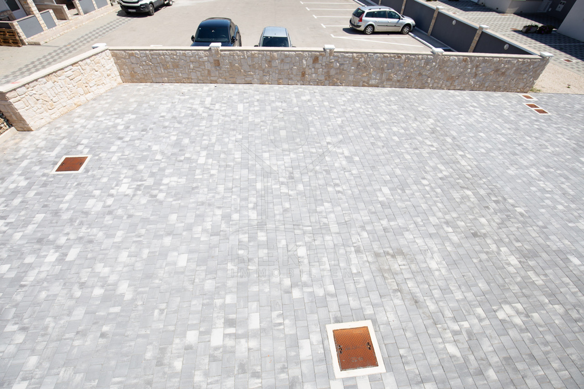 In der Stadt Vir, auf der gleichnamigen Insel, wohnen Sie hier ruhig, aber nie abgeschieden. Alles, was man im Alltag braucht, ist gut erreichbar. Die Umgebung ist gepflegt, modern bebaut und frei von Durchgangsverkehr. Ein paar Schritte genügen – und Sie stehen am Strand. Das Gebäude wurde 2025 fertiggestellt und überzeugt mit klarer, moderner Architektur. Insgesamt sechs Wohnungen verteilen sich auf zwei Etagen, je drei unten und oben. Jede Wohnung hat ihren eigenen Zugang. Vor dem Haus sind gepflasterte Flächen und für jede Wohnung ein eigener Parkplatz. Oben laden große Balkone mit Glasbrüstung zum Draußensitzen ein, unten gibt es überdachte Terrassen.