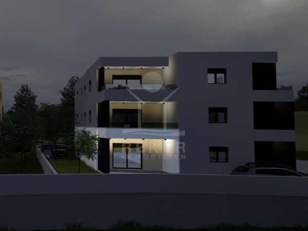 Vodice, ein ruhiges Wohnviertel, rund 700 Meter vom Zentrum entfernt. Auch zum Strand sind es nur wenige Gehminuten. Die Umgebung ist grün, locker bebaut und angenehm still. Das Gebäude wirkt modern, klar, aufgeräumt. Drei Etagen, sechs Wohnungen. Pro Stockwerk zwei Einheiten. Die Fertigstellung ist für Sommer 2026 geplant. Dann ziehen Sie schlüsselfertig ein. Vor dem Haus: ein Parkplatz pro Wohnung.