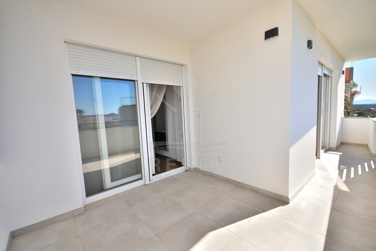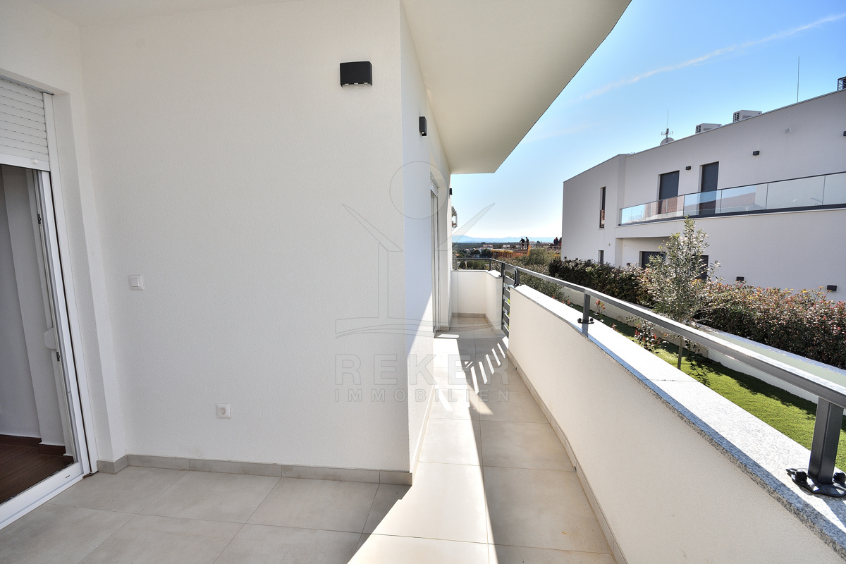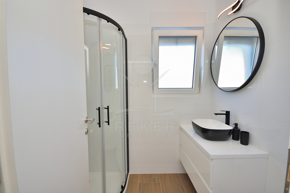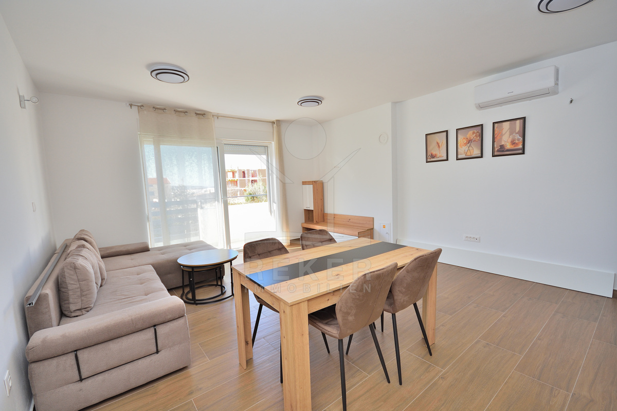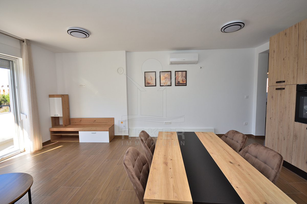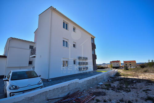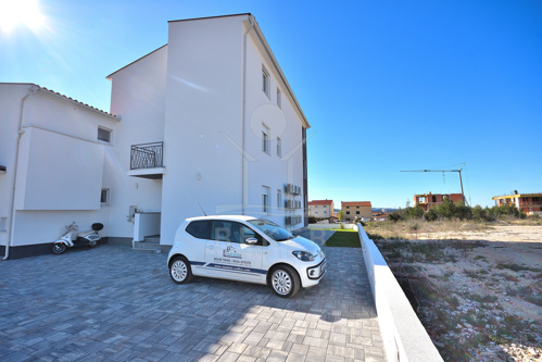 Diese Erdgeschosswohnung gehört zu einem neuen Gebäude mit nur vier Einheiten in Vodice. Die Umgebung wirkt angenehm ruhig. Einfamilienhäuser und moderne Villen prägen das Wohngebiet. Das Haus umfasst drei Etagen und befindet sich etwa 1 km vom Meer entfernt. Durch die leichte Hanglage genießen Sie einen schönen Blick auf das Meer. Praktisch im Alltag: Ein eigener Parkplatz direkt vor dem Gebäude gehört zur Wohnung.