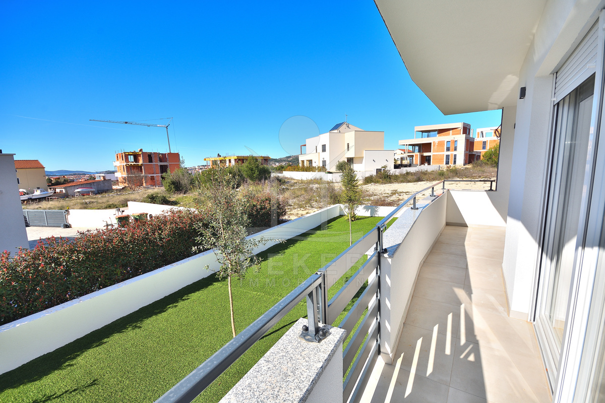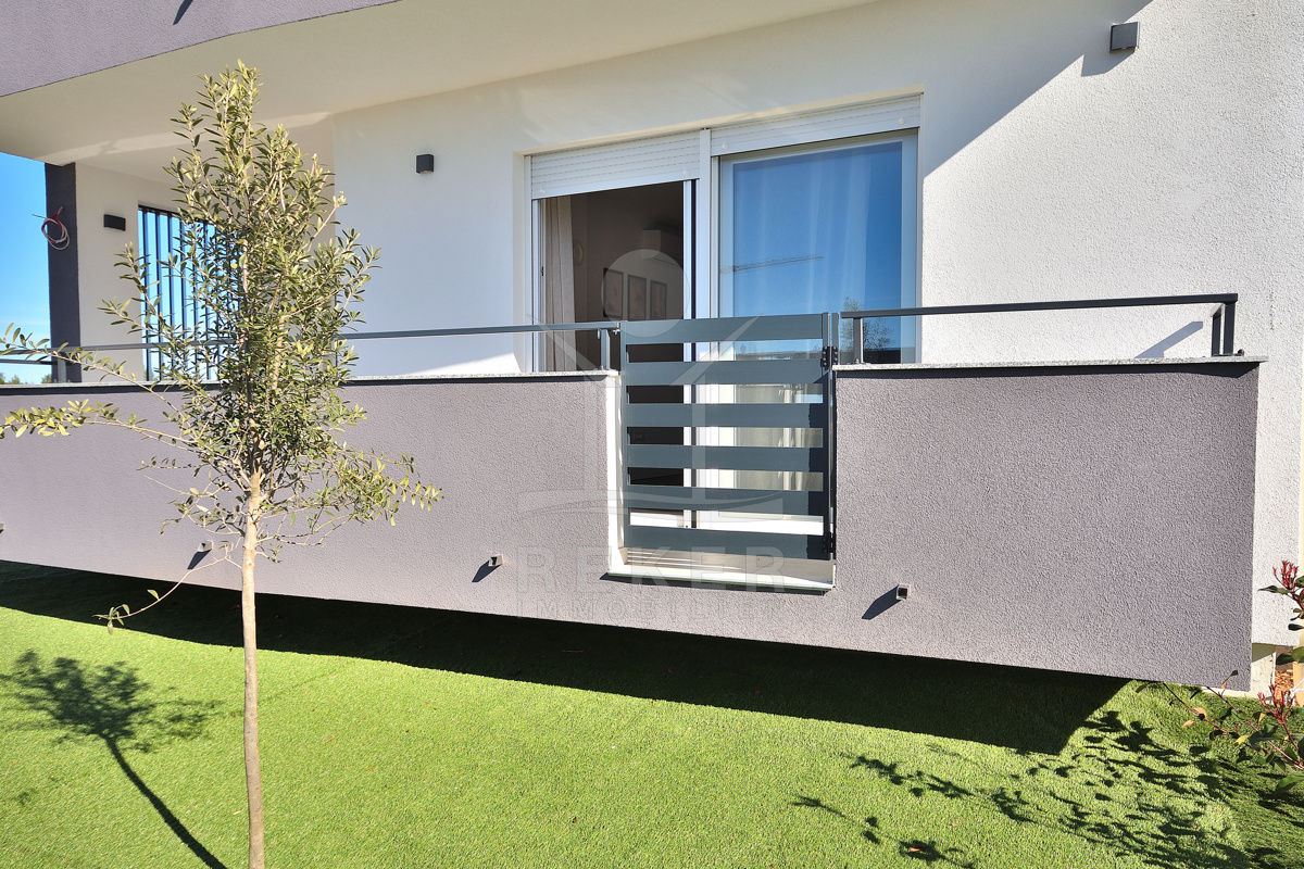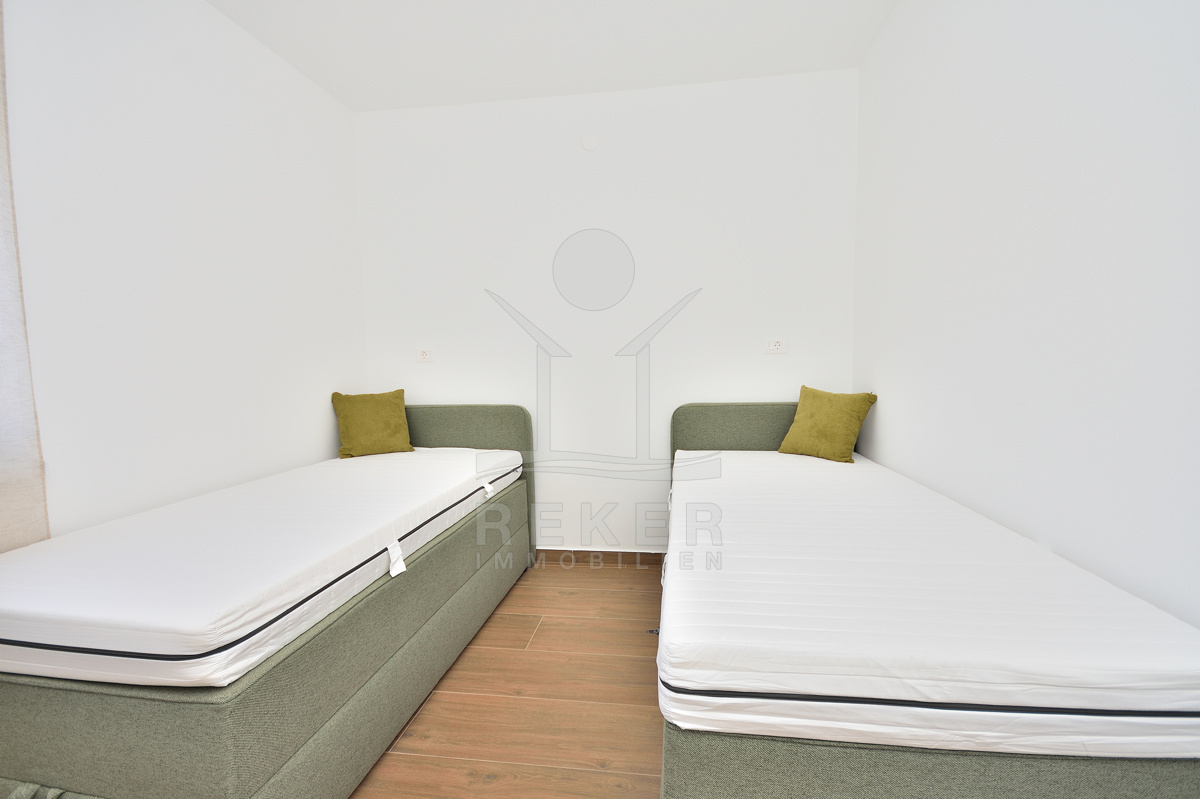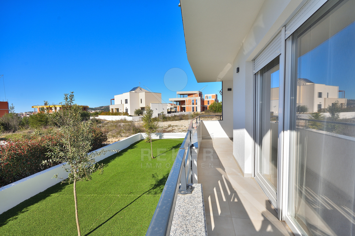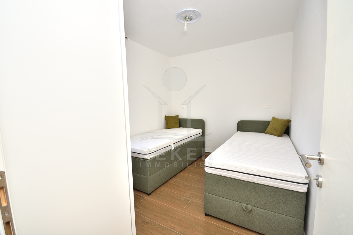 Diese Erdgeschosswohnung gehört zu einem neuen Gebäude mit nur vier Einheiten in Vodice. Die Umgebung wirkt angenehm ruhig. Einfamilienhäuser und moderne Villen prägen das Wohngebiet. Das Haus umfasst drei Etagen und befindet sich etwa 1 km vom Meer entfernt. Durch die leichte Hanglage genießen Sie einen schönen Blick auf das Meer. Praktisch im Alltag: Ein eigener Parkplatz direkt vor dem Gebäude gehört zur Wohnung.