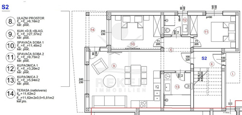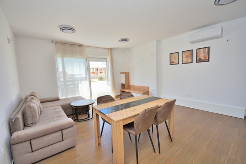Im Inneren stehen Ihnen 63,90 m² Wohnfläche zur Verfügung. Der Grundriss beginnt mit einem Flur. Von hier aus erreichen Sie zwei Schlafzimmer und zwei Badezimmer. Das Wohnzimmer verbindet Küche und Essbereich zu einem offenen Wohnraum. Von dort gelangen Sie direkt auf die Terrasse. Die Wohnung wird vollständig möbliert und ausgestattet verkauft.