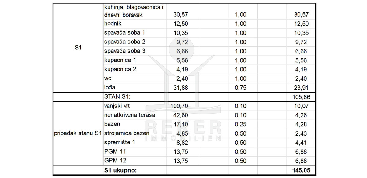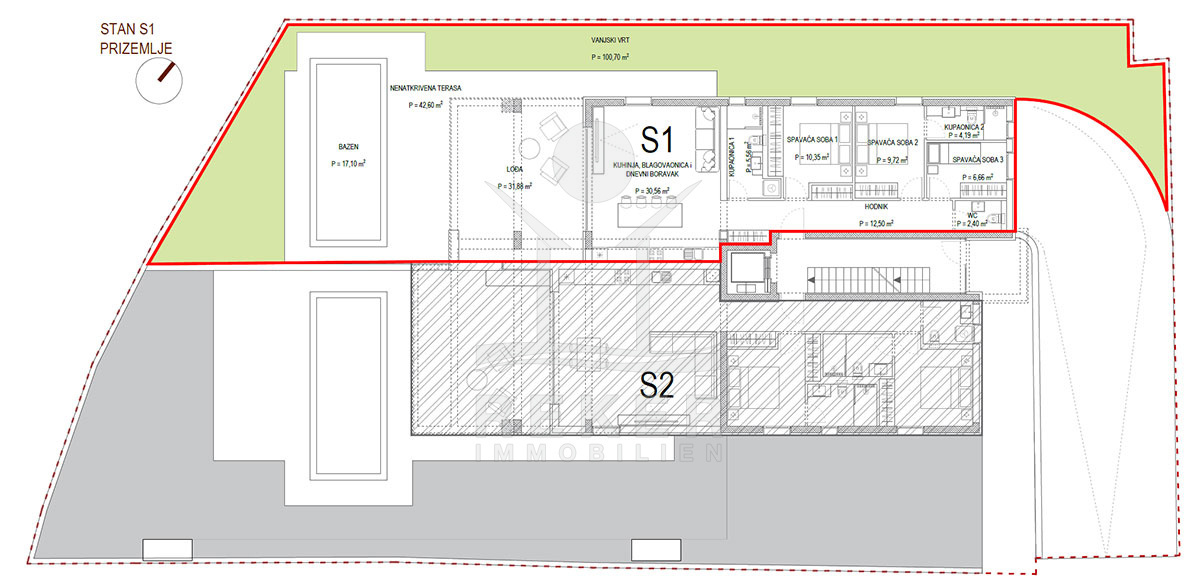 Im Außenbereich wird eine Terrasse geplant, mit einer Fläche vom 42,60 m² und bietet Platz für entspannte Stunden im Freien. Ein begehbarer Gartenbereich mit Grünflächen und einem Pool (17,10 m²) schafft eine wunderbare private Oase, perfekt für Entspannung und Zusammenkünfte im Freien.