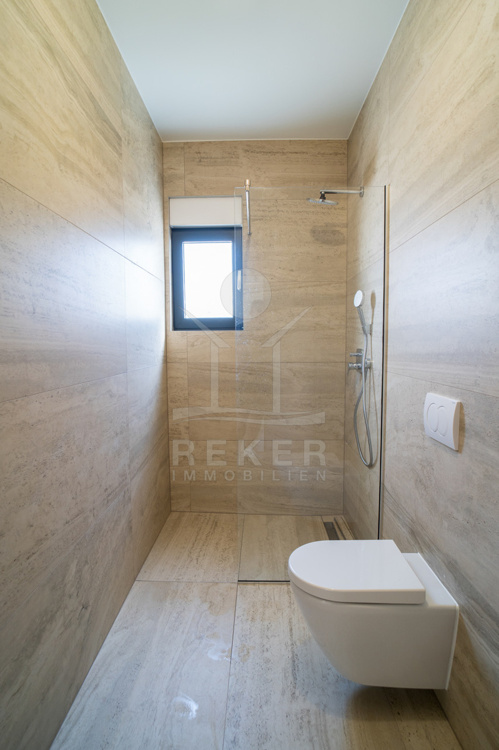 Eines der Schlafzimmer hat ein eigenes Bad – ideal für Gäste oder ein Elternzimmer. Die anderen beiden liegen direkt neben dem zweiten Bad. Dazu kommt ein Hauswirtschaftsraum mit Waschmaschinenanschluss und ein praktischer Abstellraum im Erdgeschoss – perfekt für Vorräte, Koffer oder Strandutensilien.