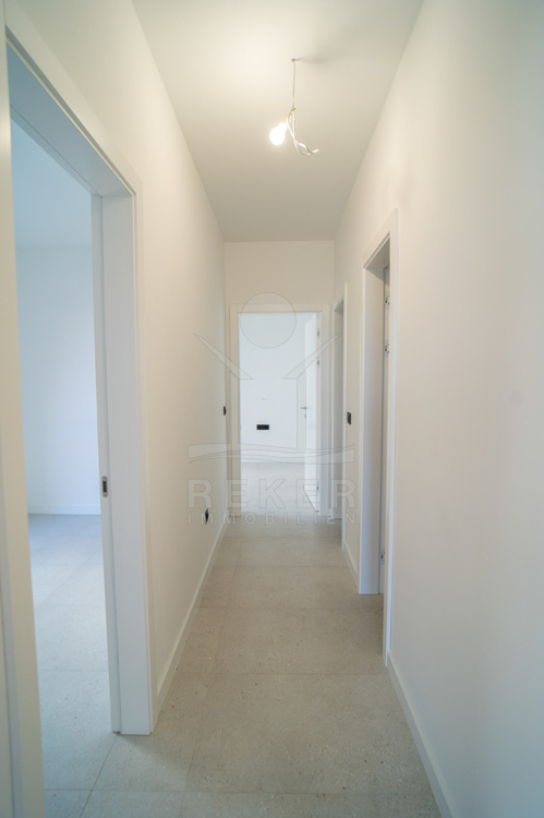 Viel Platz, viel Komfort, alles auf einer Ebene. Diese Wohnung im Erdgeschoss bietet rund 127 m² Innenfläche und hat alles, was das Wohnen leicht macht: ein offener Wohnraum mit Küche, drei Schlafzimmer, zwei voll ausgestattete Bäder und ein zusätzliches WC. Die Böden sind gefliest, beheizt wird über eine Fußbodenheizung in allen Räumen. Im Sommer sorgt die Klimaanlage für angenehme Temperaturen. Elektrische Rollläden geben zusätzlichen Komfort, die Video-Türsprechanlage sorgt für Sicherheit.
