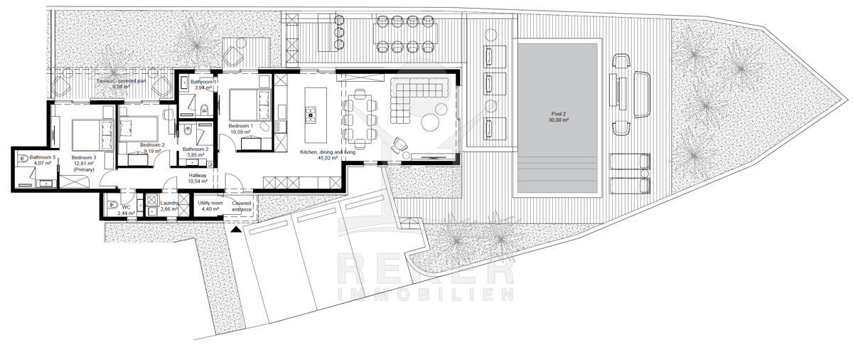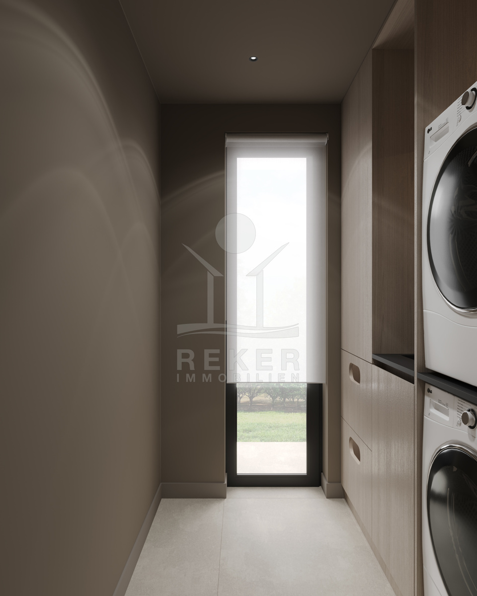 Draußen beginnt der eigentliche Luxus: Fast 120 m² Garten, eine überdachte Terrasse und ein Lounge-Bereich rund um den eigenen Pool. Das Design? Modern, reduziert, hochwertig – wie das ganze Gebäude. Drei Stellplätze gehören zur Wohnung. Perfekt für alle, die Wert auf Raum, Funktion und Stil legen.