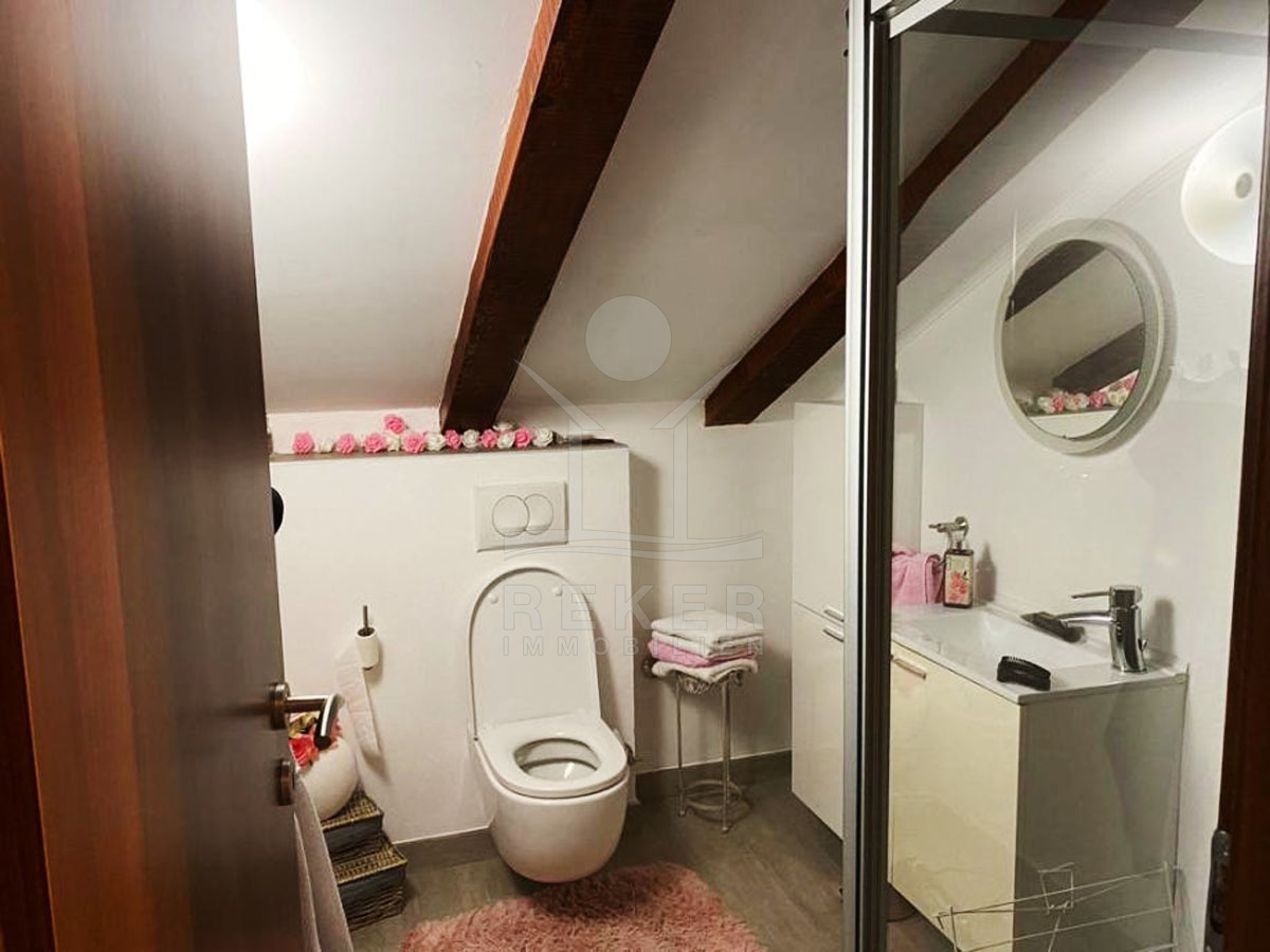 Im ersten Stock befindet sich eine zweistöckige Wohnung mit einer voll ausgestatteten Küche, einem Esszimmer und einem Wohnzimmer mit Balkon. Ein Badezimmer und ein Abstellraum bieten weiteren Komfort. Eine Innentreppe führt zu einem hohen Dachboden mit zwei Schlafzimmern, einem Badezimmer und einer gemütlichen Arbeitsecke, was zusätzliche Wohnmöglichkeiten schafft.