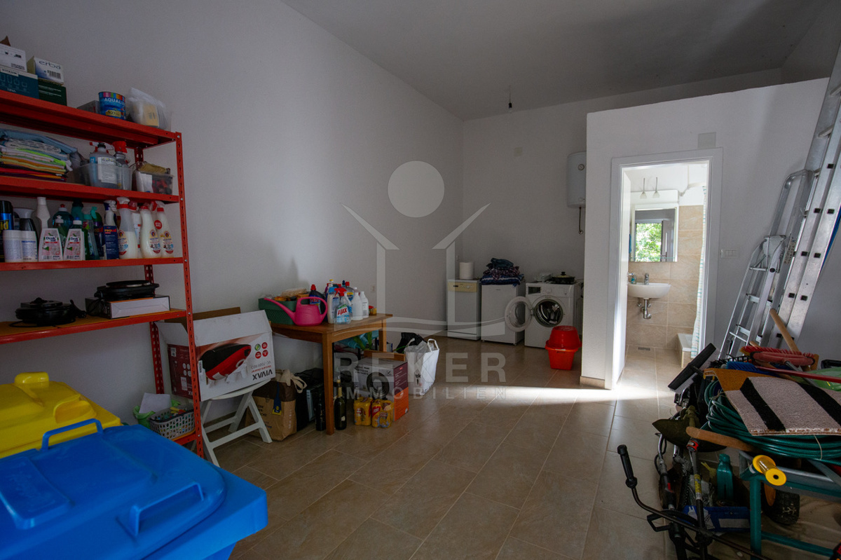 695 Quadratmeter Grundstück – und kein Zentimeter verschenkt. Olivenbäume, Feigen, Naturstein, alles gepflegt. Die Terrasse ist groß, perfekt für lange Abende draußen. Ein gemauerter Grill steht bereit. Alles eingezäunt. Sicher. Übersichtlich. Und einfach schön.
