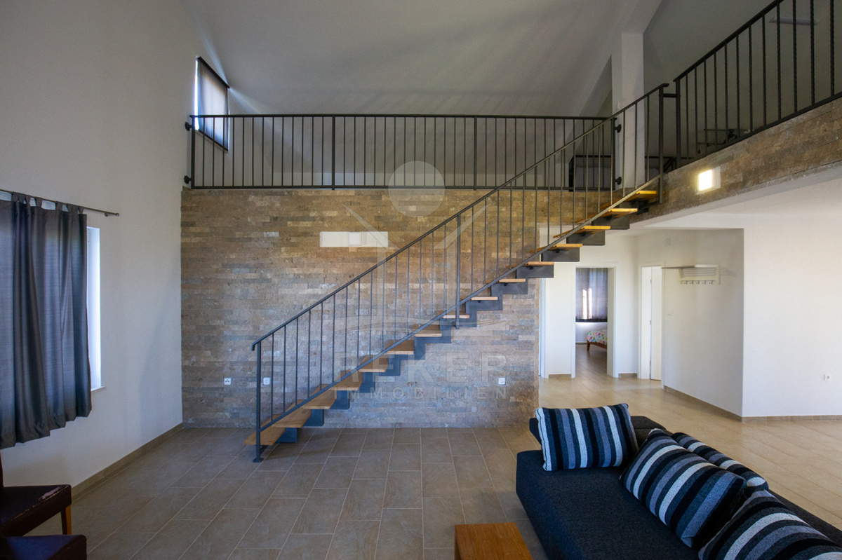 Im Obergeschoss wartet eine großzügige Wohnung mit rund 128 Quadratmetern. Zwei Schlafzimmer, ein Badezimmer, ein heller Wohnbereich mit integrierter Küche – und eine offene Galerie, die für ein ganz besonderes Raumgefühl sorgt. Der Balkon rundet das Ganze ab. Perfekt für entspannte Abende mit Blick ins Grüne. Alles klimatisiert, mit Kamin, komplett möbliert – einfach einziehen und wohlfühlen.