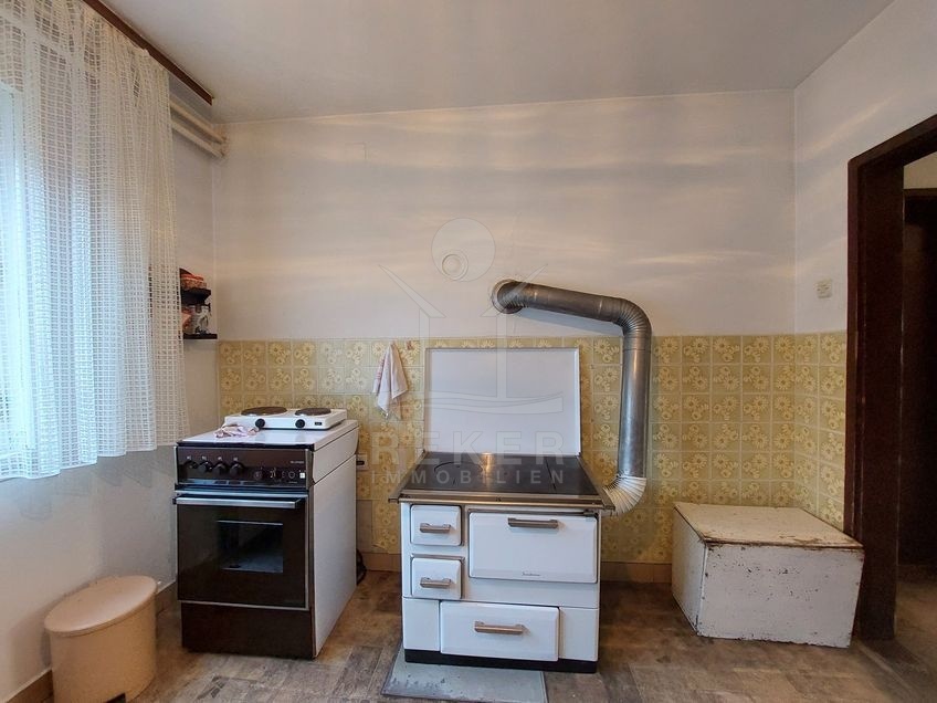 Im Erdgeschoss finden Sie ein Wohnzimmer mit Holzofen, ein Schlafzimmer, eine Küche mit Holzofen, einen Abstellraum und ein Badezimmer mit Badewanne.