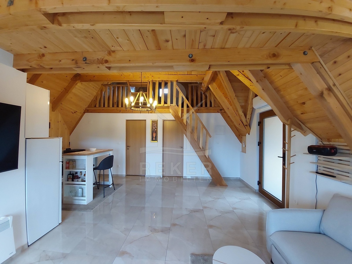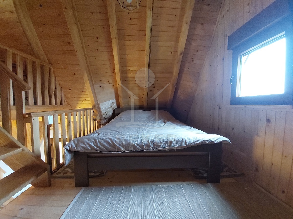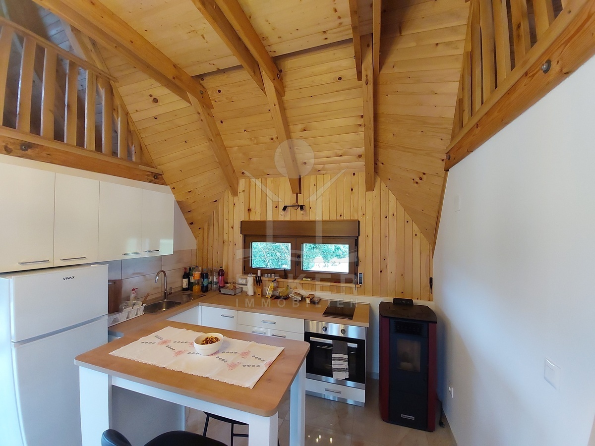 Innen zeigt sich das Haus von seiner modernen Seite – mit vielen warmen Holzoberflächen und einer offenen Bauweise. Der Wohnbereich im Erdgeschoss geht nahtlos in die Küche über. Zwei Schlafzimmer und ein Bad mit Dusche und Waschmaschine machen das Erdgeschoss komplett. Oben auf der Galerie wartet ein zweiter Wohnraum mit Blick ins Grüne – und ein erhöhtes Bett mit Aussicht über den Fluss. Alles ist neu, möbliert und bezugsbereit – einfach einziehen und wohlfühlen.