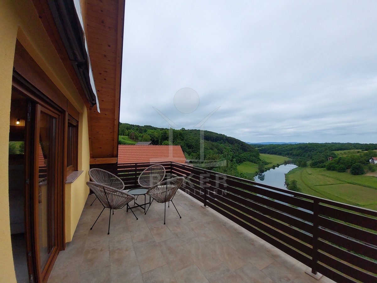 In Barilović, mitten im Grünen und doch nur knapp 20 Minuten von Karlovac entfernt, steht dieses Haus an einem Ort, der wie gemacht ist zum Runterkommen. Direkt an der Korana gelegen, in einem kleinen Weiler, ohne Durchgangsverkehr. Wer hier wohnt, hört Wasser statt Motoren, sieht Felder statt Zäune und genießt Natur pur – ohne auf Infrastruktur verzichten zu müssen. Der Ort hat alles fürs tägliche Leben. Und wenn es doch mal mehr sein darf, ist die Stadt schnell erreicht.