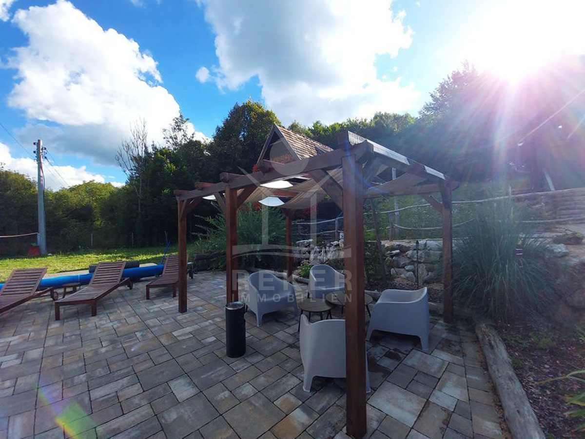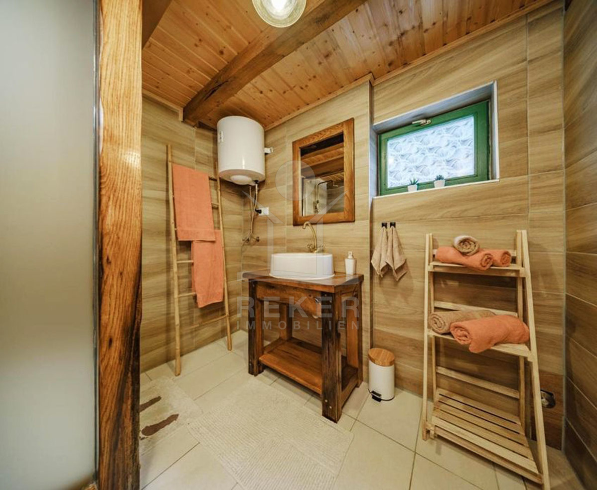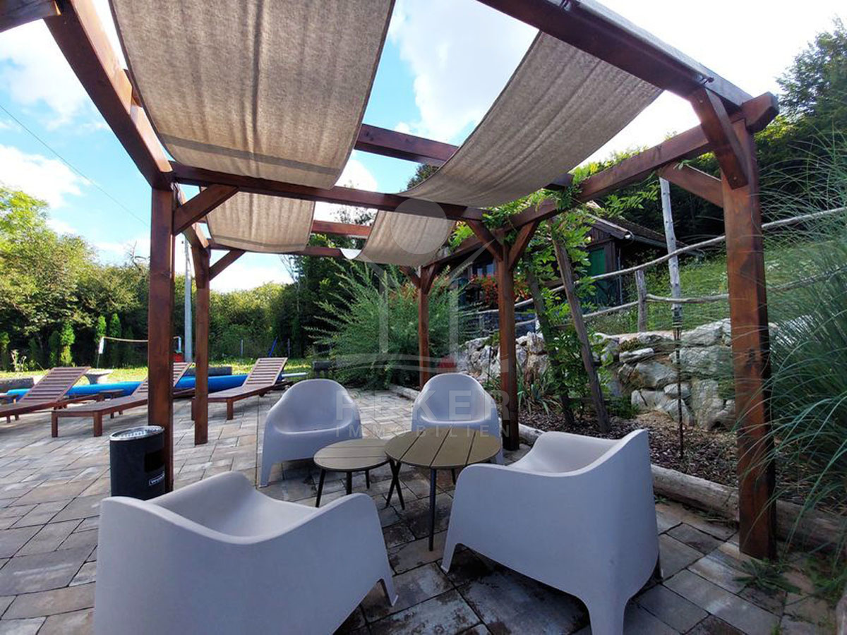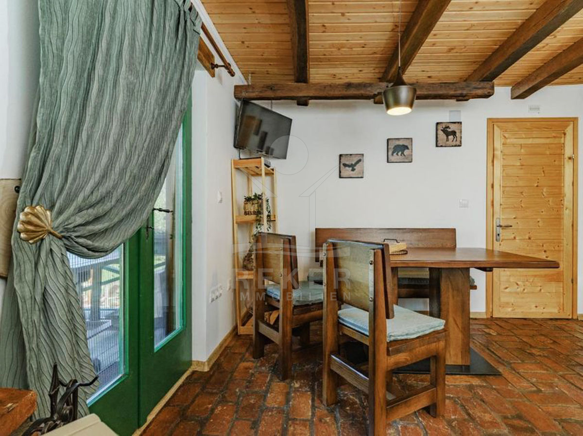 Diese einzigartige Freizeitanlage erstreckt sich über insgesamt 15376 m², wovon 5580 m² in der Tourismuszone, 2856 m² in der Bauzone und 6940 m² in der Landwirtschaftszone liegen. Die Anlage umfasst 4 gut ausgestattete Ferienhäuser, die jeweils ca. 60 m² groß sind und sich über 2 Etagen erstrecken. Mit modernster Bauweise aus Eichenholz und hochwertigen Materialien bietet die Immobilie sowohl Komfort als auch eine ansprechende Optik. Ein komplett versorgter Anschluss an das Strom- und Wassernetz sowie eine Pelletheizung versichern Ihnen ganzjährig eine angenehme Atmosphäre. Insgesamt beherbergt diese Anlage 8 Zimmer, darunter 4 Schlafzimmer und 4 Badezimmer sowie Küchenzeilen, 4 Balkone und 5 Terrassen, die Ihnen viel Freiraum und Möglichkeiten zur individuellen Gestaltung bieten.