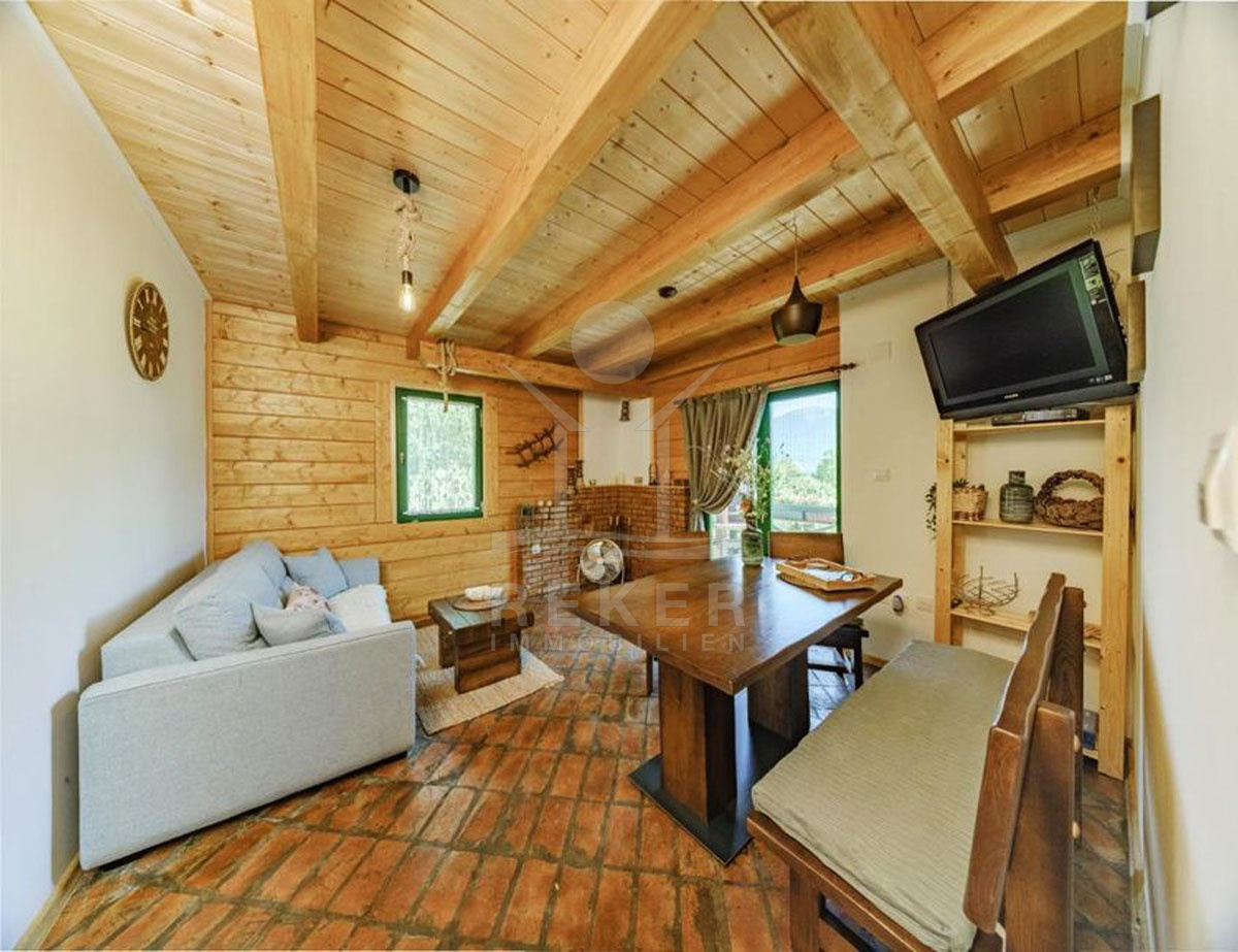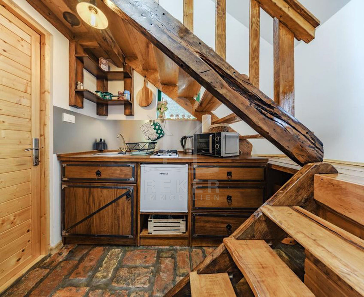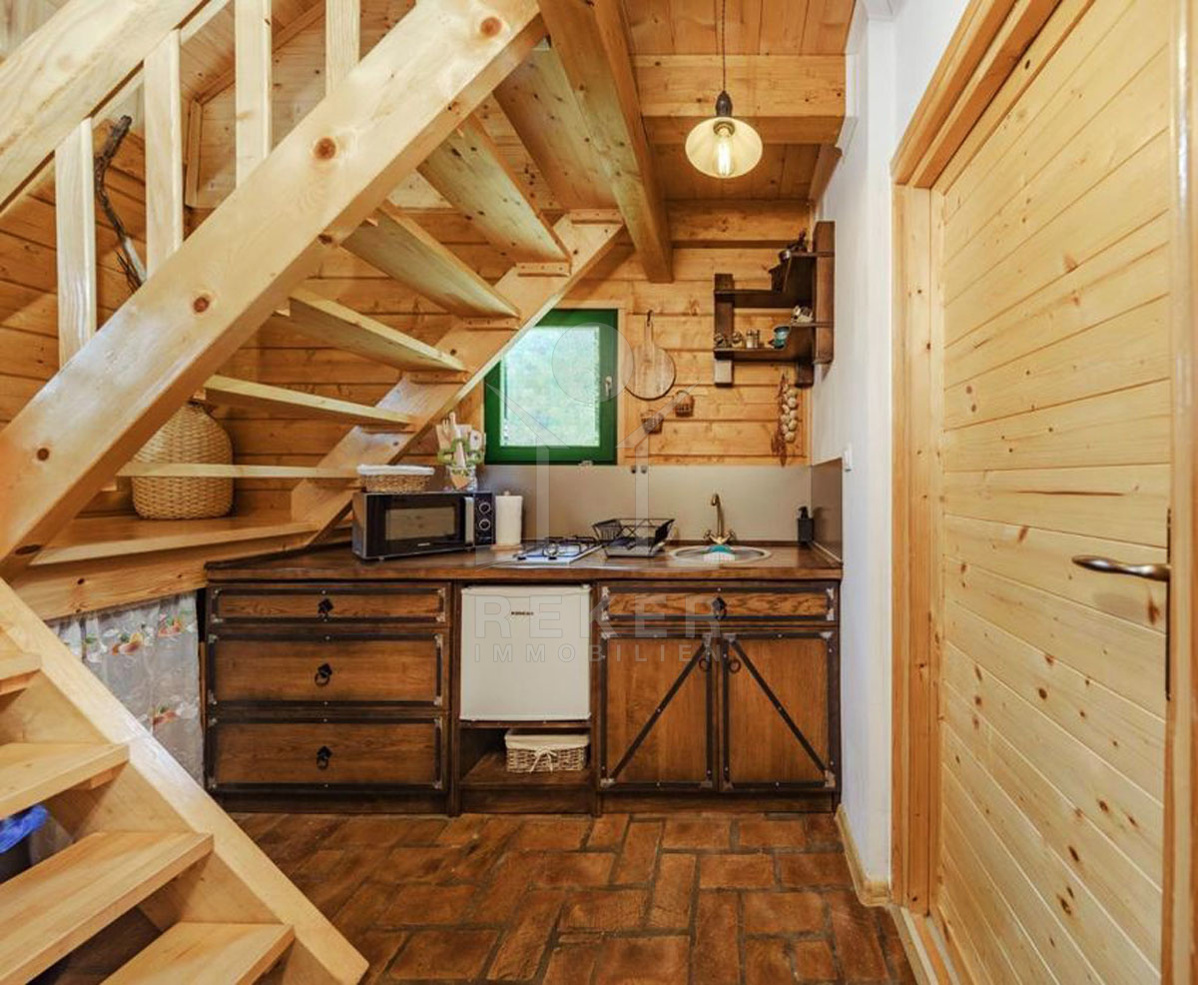 Die bezaubernden Holzhäuser werden inklusive der Möbel verkauft und versprechen eine gemütliche Atmosphäre. Bei Haus 1 betreten Sie den Eingangsbereich durch eine Terrasse mit Grill, die zum Entspannen einlädt. Der offene Wohn- und Essbereich schafft ein einladendes Ambiente, während das moderne Badezimmer mit Dusche und die Küchenzeile unter der Treppe praktische Annehmlichkeiten bieten. Eine interne Holztreppe führt in das Obergeschoss, wo sich das Schlafzimmer und ein süßer Balkon mit Blick nach draußen befinden.
