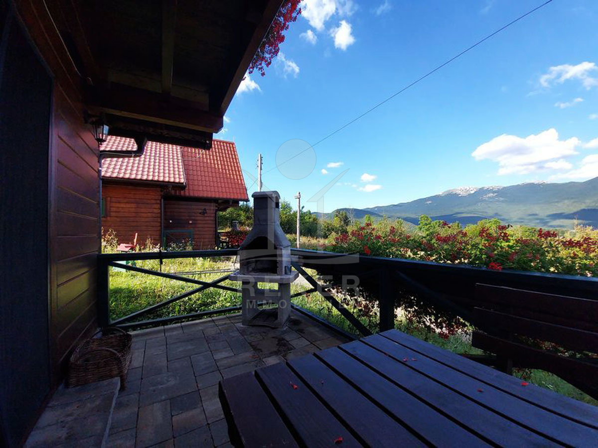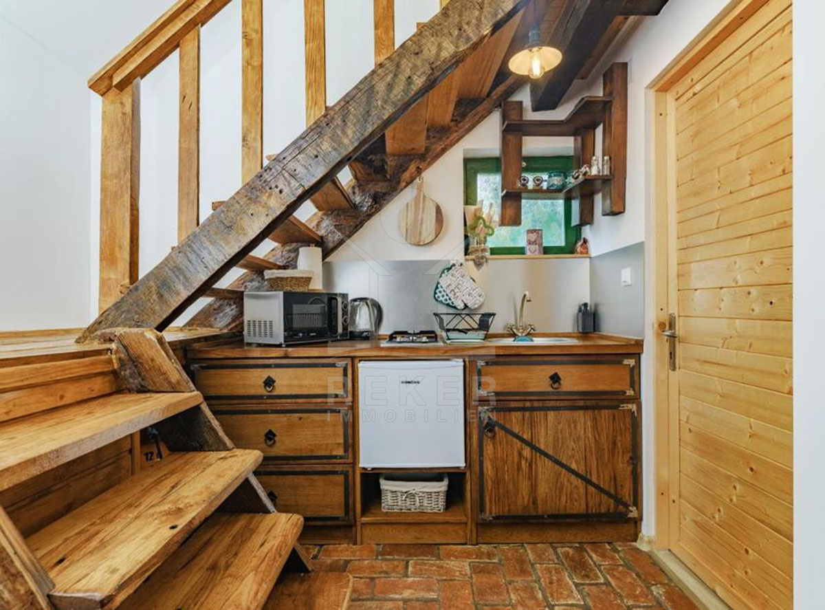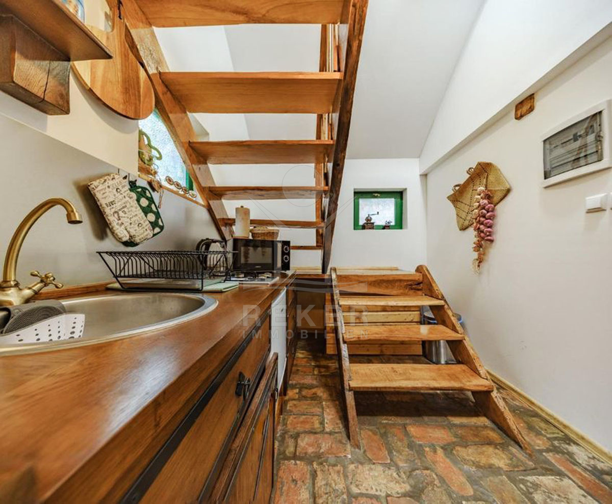 Die bezaubernden Holzhäuser werden inklusive der Möbel verkauft und versprechen eine gemütliche Atmosphäre. Bei Haus 1 betreten Sie den Eingangsbereich durch eine Terrasse mit Grill, die zum Entspannen einlädt. Der offene Wohn- und Essbereich schafft ein einladendes Ambiente, während das moderne Badezimmer mit Dusche und die Küchenzeile unter der Treppe praktische Annehmlichkeiten bieten. Eine interne Holztreppe führt in das Obergeschoss, wo sich das Schlafzimmer und ein süßer Balkon mit Blick nach draußen befinden.