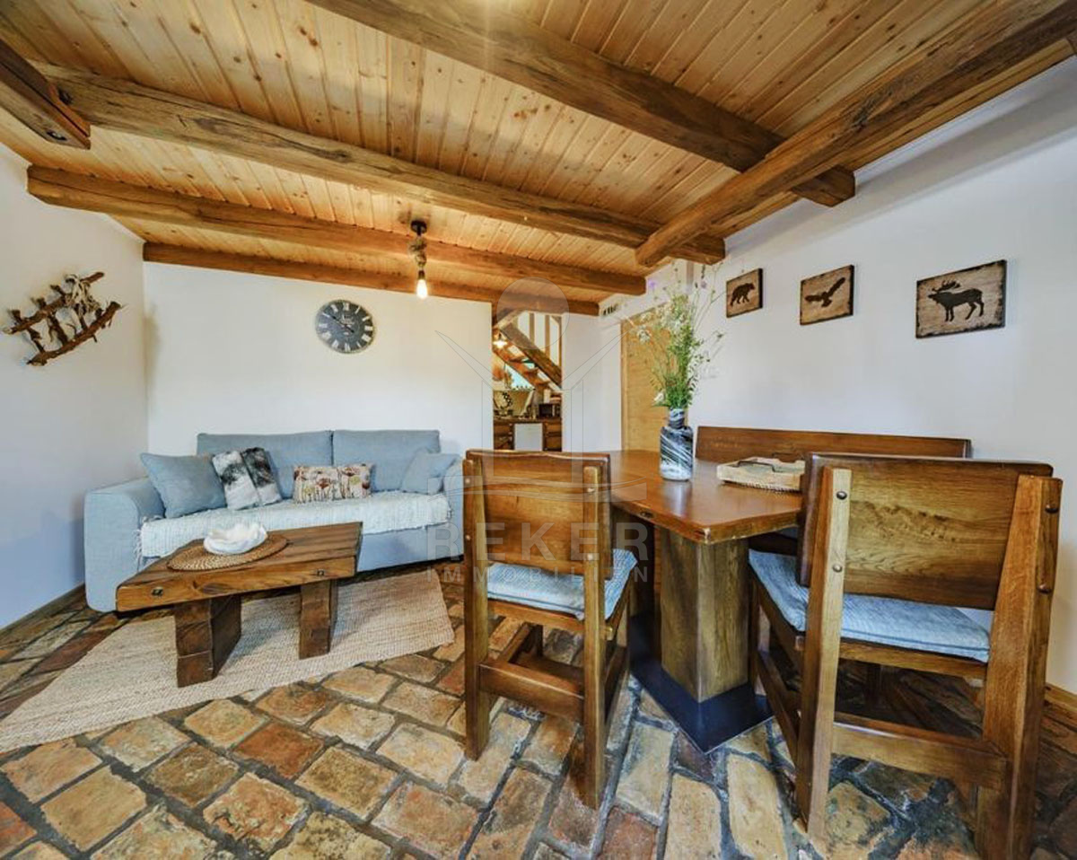 Haus 3 überzeugt ebenfalls mit einem einladenden, rustikalen Ambiente. Der Wohn-, Ess- und Küchenbereich ist freundlich gestaltet und bietet Platz für gesellige Abende. Im Obergeschoss führt eine interne Holztreppe zu einem gemütlichen Schlafzimmer.