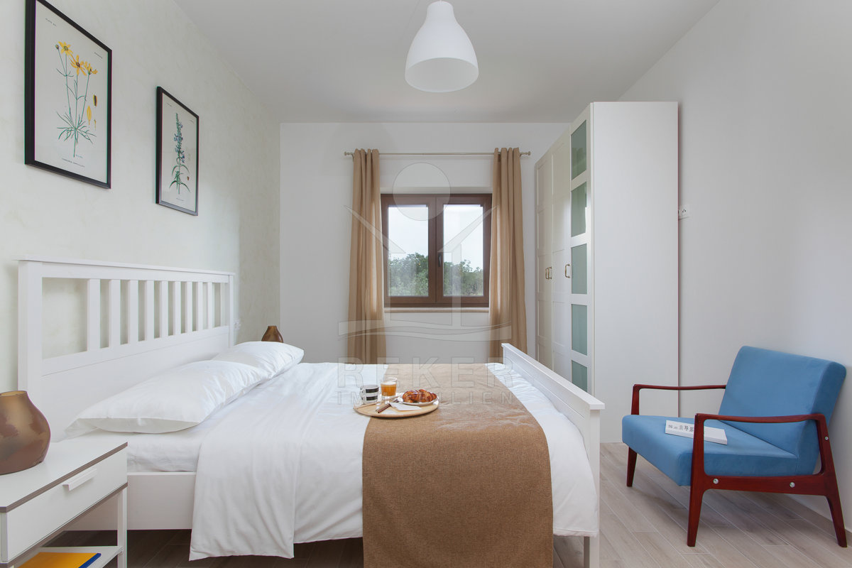 Der authentische Charme des Steinhauses wird durch restaurierte Holzbalken, Fenster und Türen aus Holz sowie den Einsatz von istrischem Stein hervorgehoben. Die Inneneinrichtung besteht aus einer Mischung aus Familienstücken, Designerstücken und einigen praktischen Ikea-Möbeln. Eine gut gelöste Wärmedämmung sorgt dafür, dass das Haus das ganze Jahr über angenehm temperiert ist.