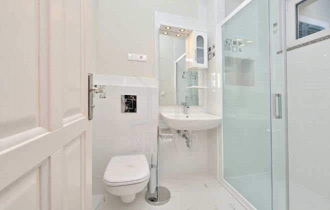 Freuen Sie sich in diesem Bad besonders auf die große barrierefreie Dusche, neben modernem Waschtisch und Wand-WC