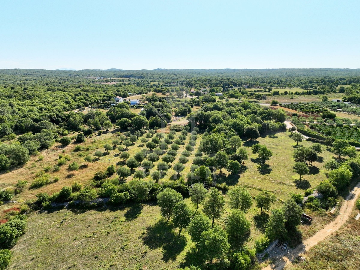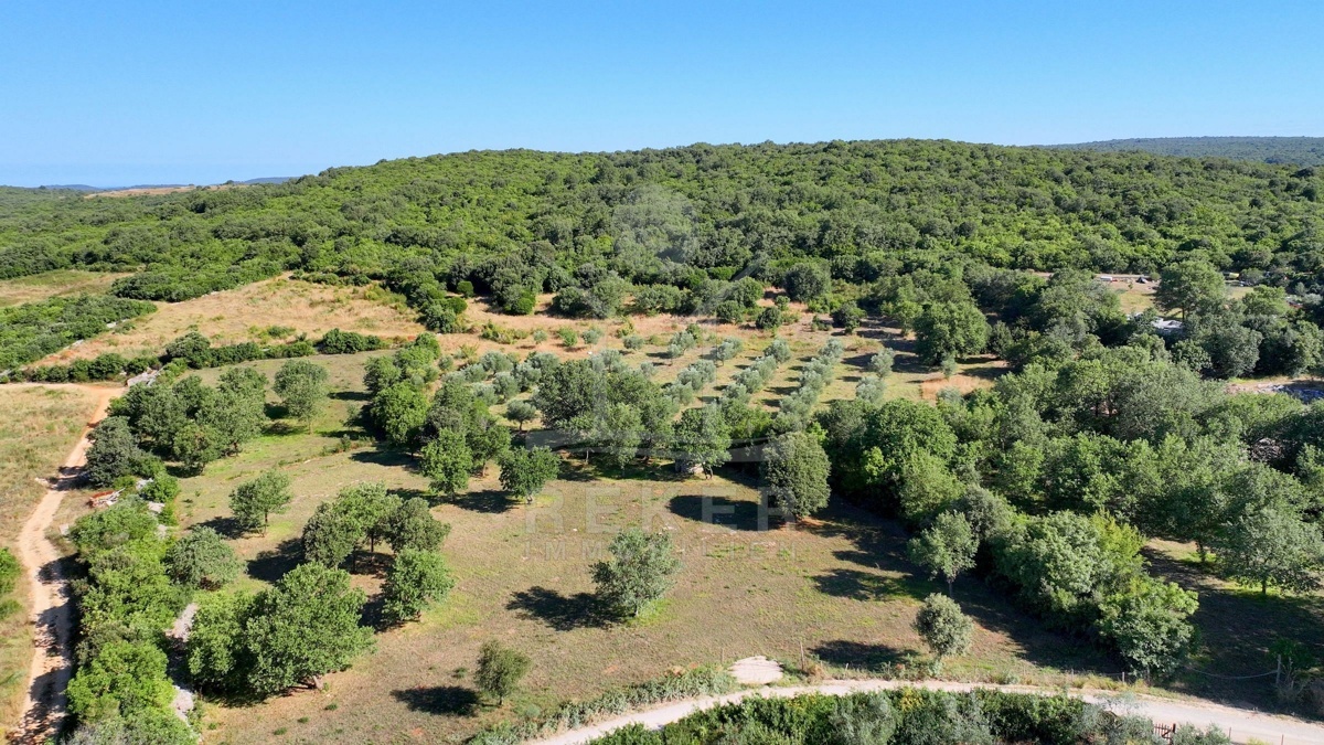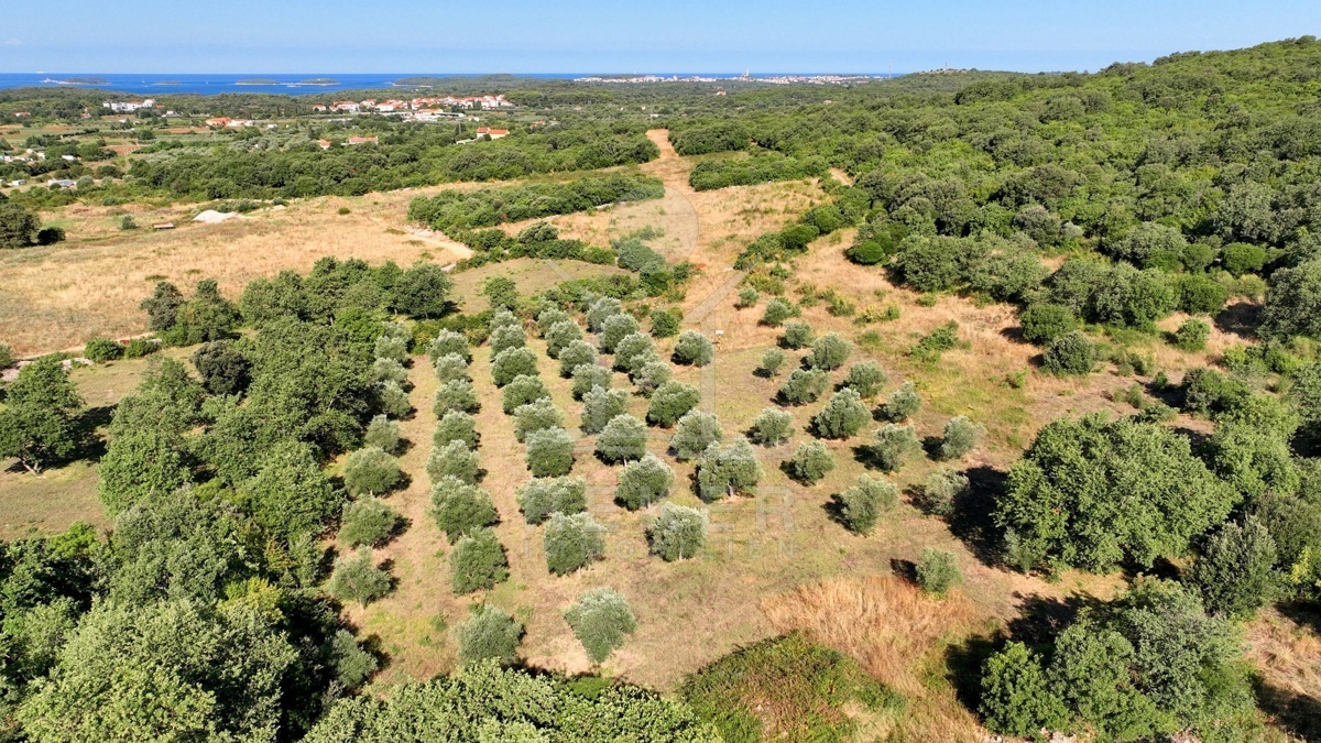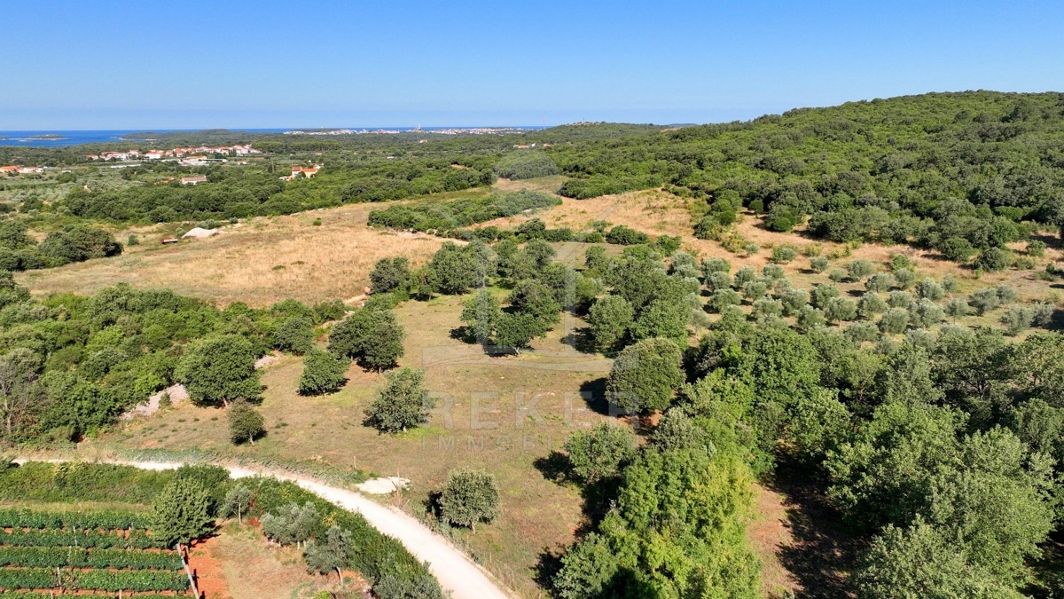 Südlich von Rovinj, nur 2,4 km vom Meer entfernt, erstreckt sich ein großzügiges Grundstück mit rund 19.500 m² Fläche. Die Umgebung ist ruhig, ländlich und von sanften Hügeln geprägt. Von hier aus reicht der Blick über die grüne Landschaft bis hin zum Meer. Etwa 60 Olivenbäume wachsen auf dem Gelände, umgeben von Wiesen und naturbelassenem Buschland. Zwei Schotterstraßen führen entlang der Nord- und Südseite und ermöglichen bequemen Zugang. Wasser ist angeschlossen, Strom verläuft an der Grundstücksgrenze.
