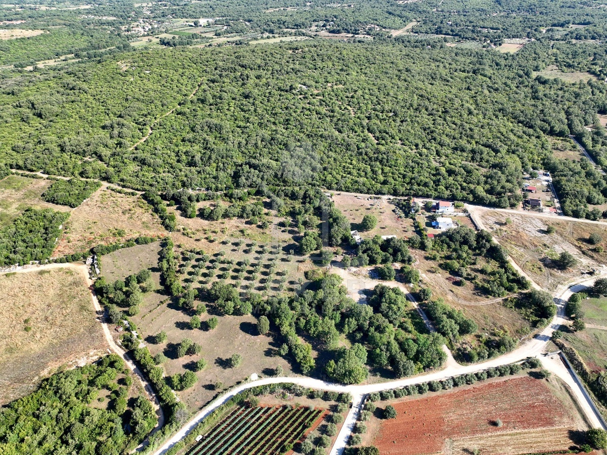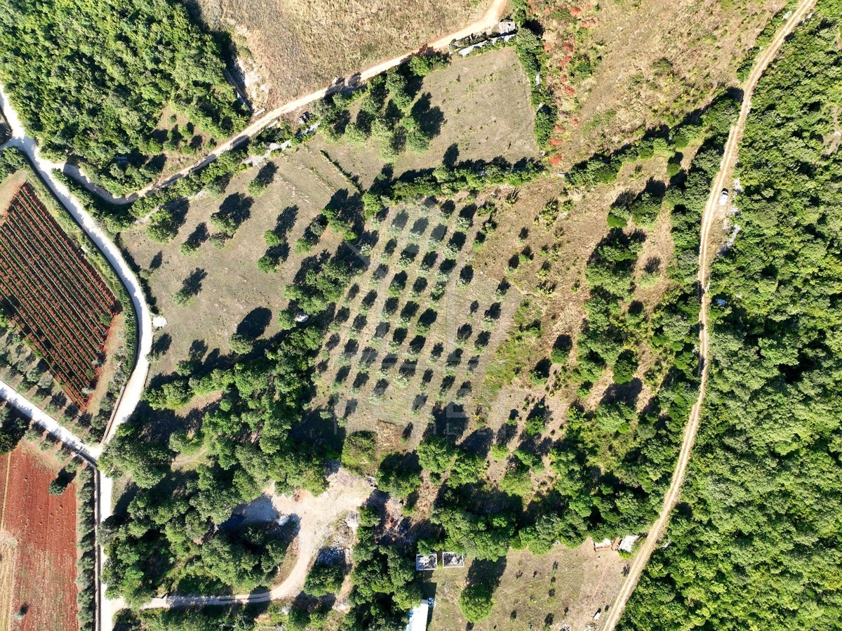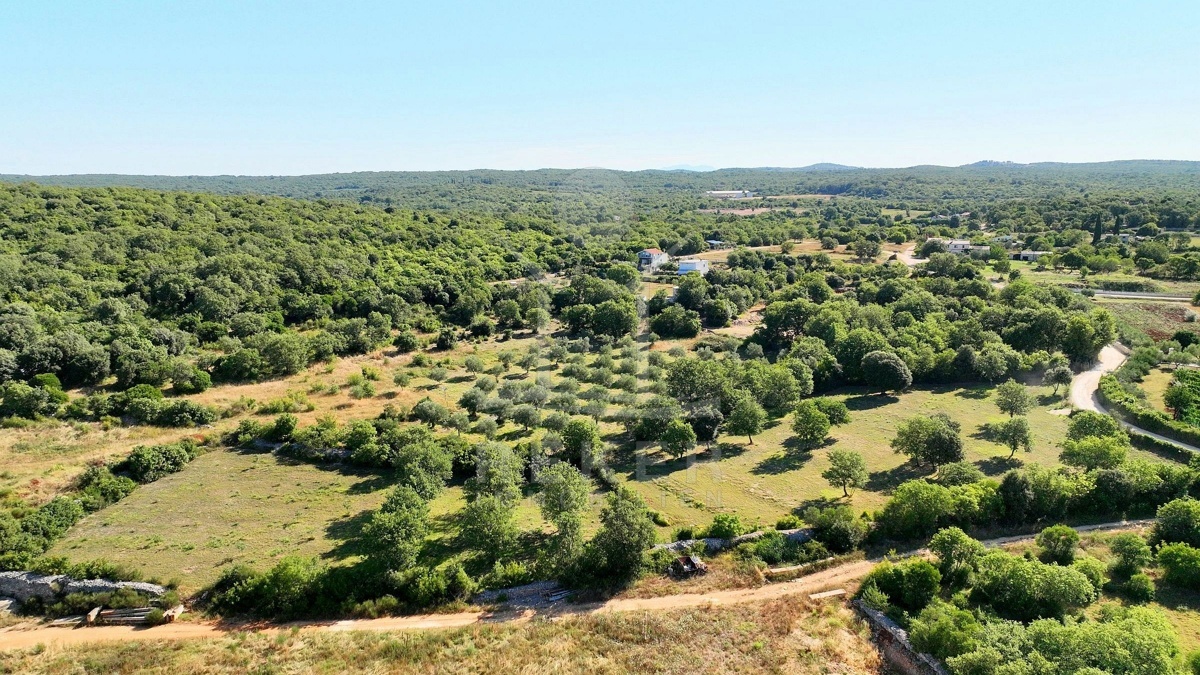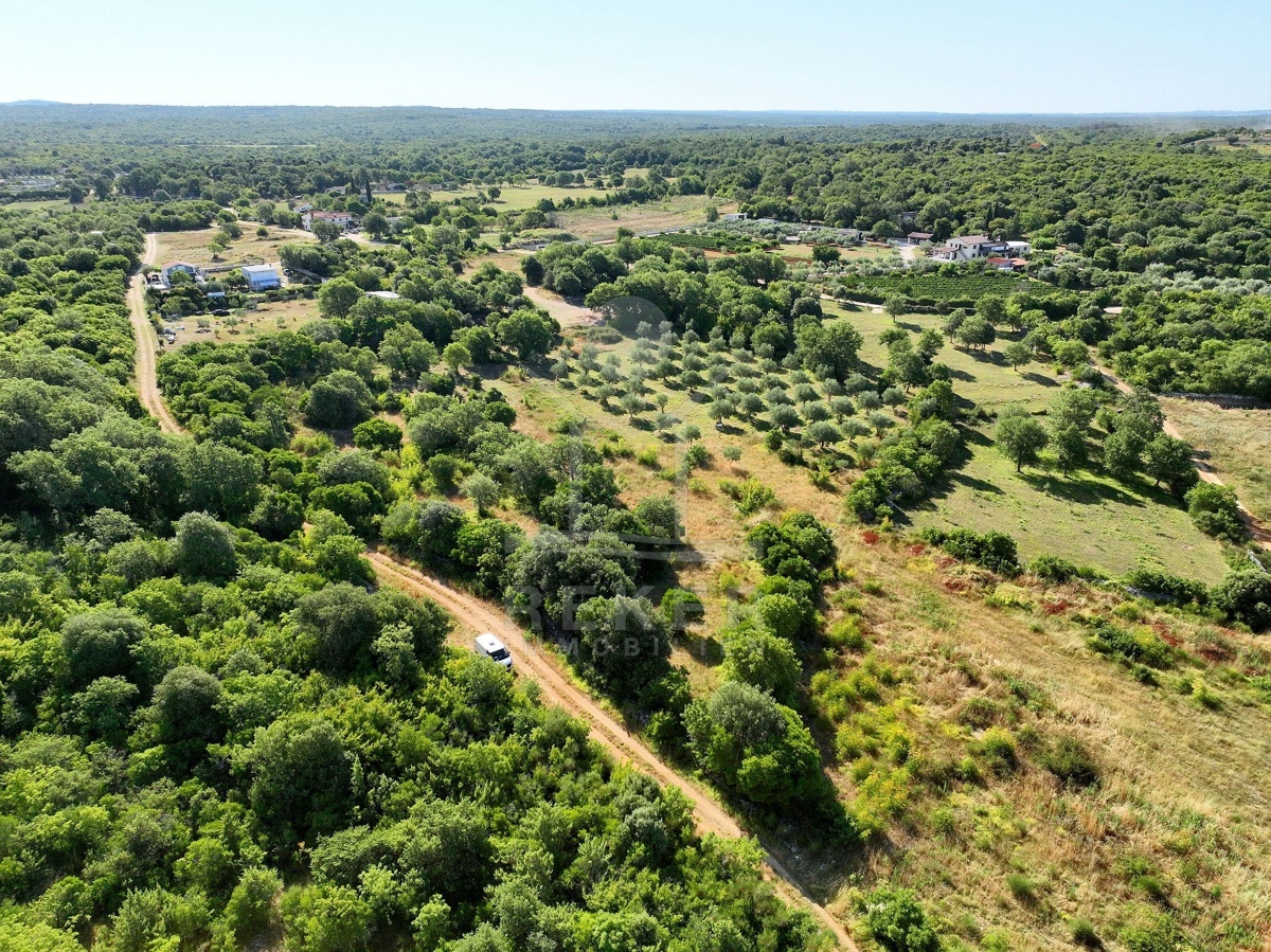 Südlich von Rovinj, nur 2,4 km vom Meer entfernt, erstreckt sich ein großzügiges Grundstück mit rund 19.500 m² Fläche. Die Umgebung ist ruhig, ländlich und von sanften Hügeln geprägt. Von hier aus reicht der Blick über die grüne Landschaft bis hin zum Meer. Etwa 60 Olivenbäume wachsen auf dem Gelände, umgeben von Wiesen und naturbelassenem Buschland. Zwei Schotterstraßen führen entlang der Nord- und Südseite und ermöglichen bequemen Zugang. Wasser ist angeschlossen, Strom verläuft an der Grundstücksgrenze.