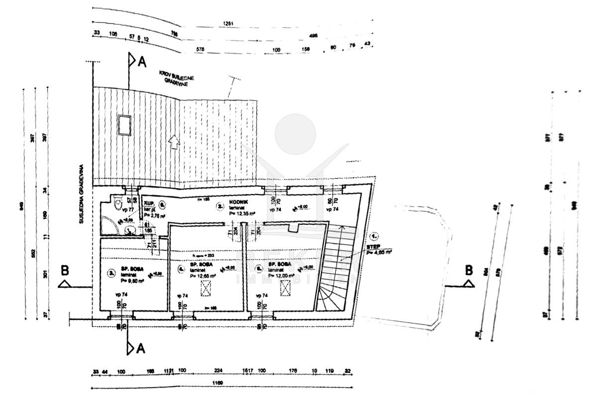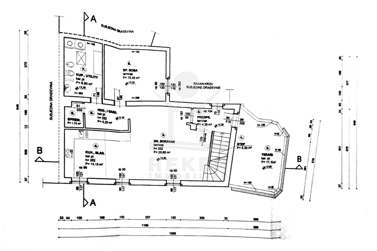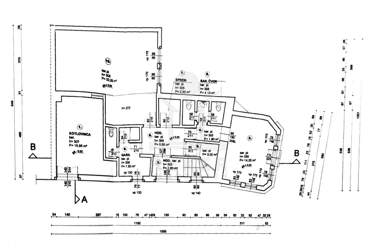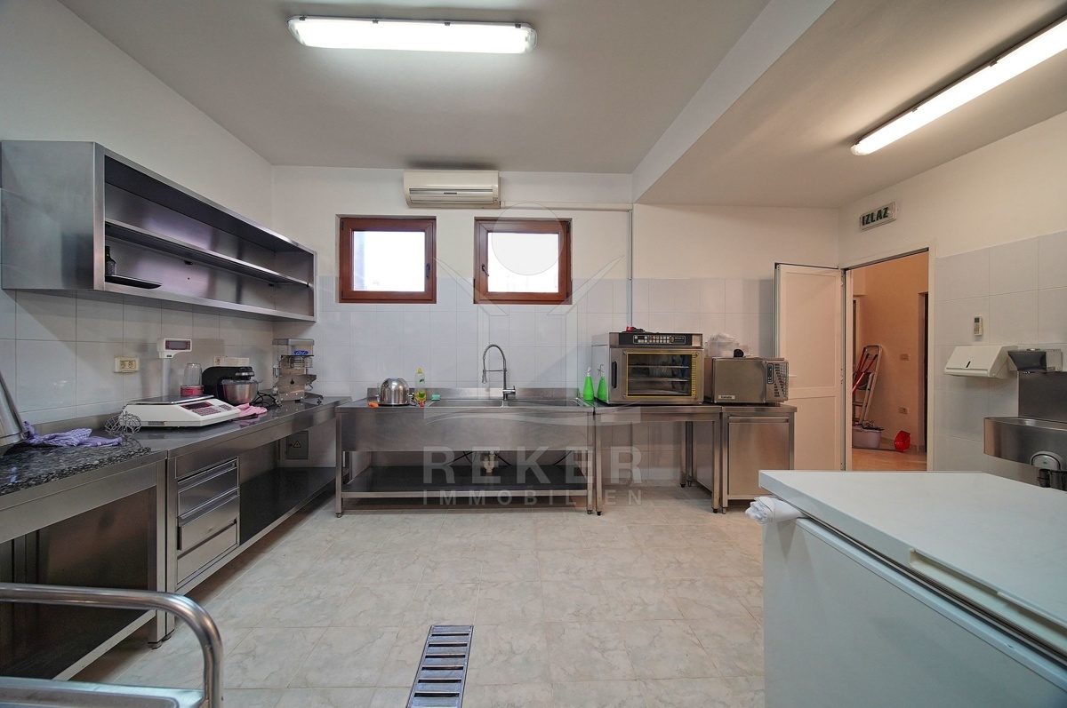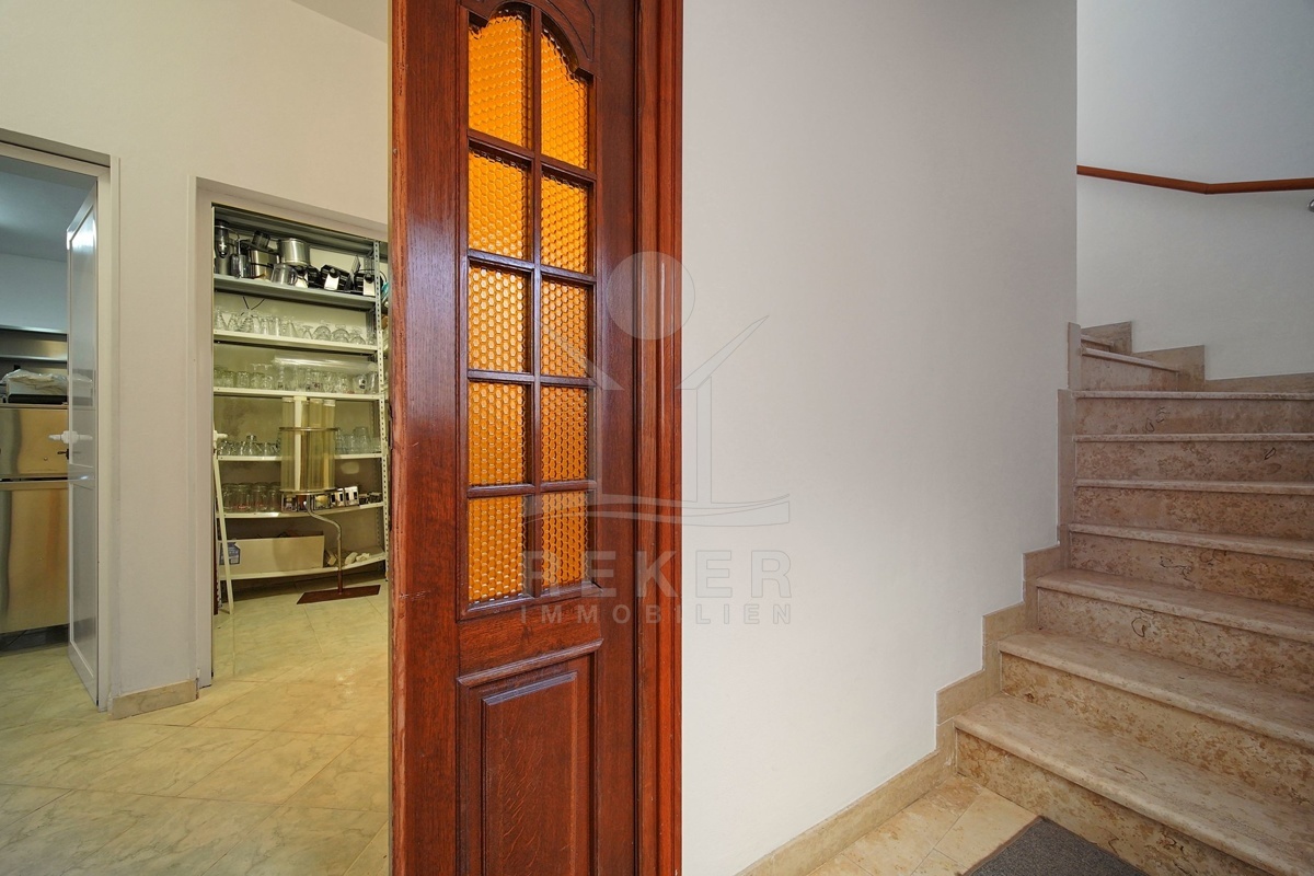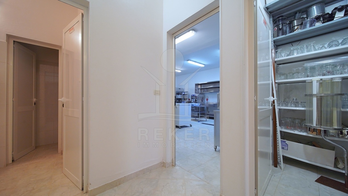 Den größten Teil des Erdgeschosses nehmen Geschäftsräume ein, die als Gastronomiebetrieb genutzt werden und aus einem Raum mit Bar von 14 m², einer Garderobe, Sanitäranlagen und einem Raum für die Essenszubereitung von 32 m² bestehen. Die Gesamtfläche aller zum Geschäftslokal gehörenden Räumlichkeiten beträgt 73,95 m². Darüber hinaus gibt es im Erdgeschoss auch den Eingang zum Haus und einen Abstellraum mit Heizräumen, dessen Fläche 15,95 m² beträgt.