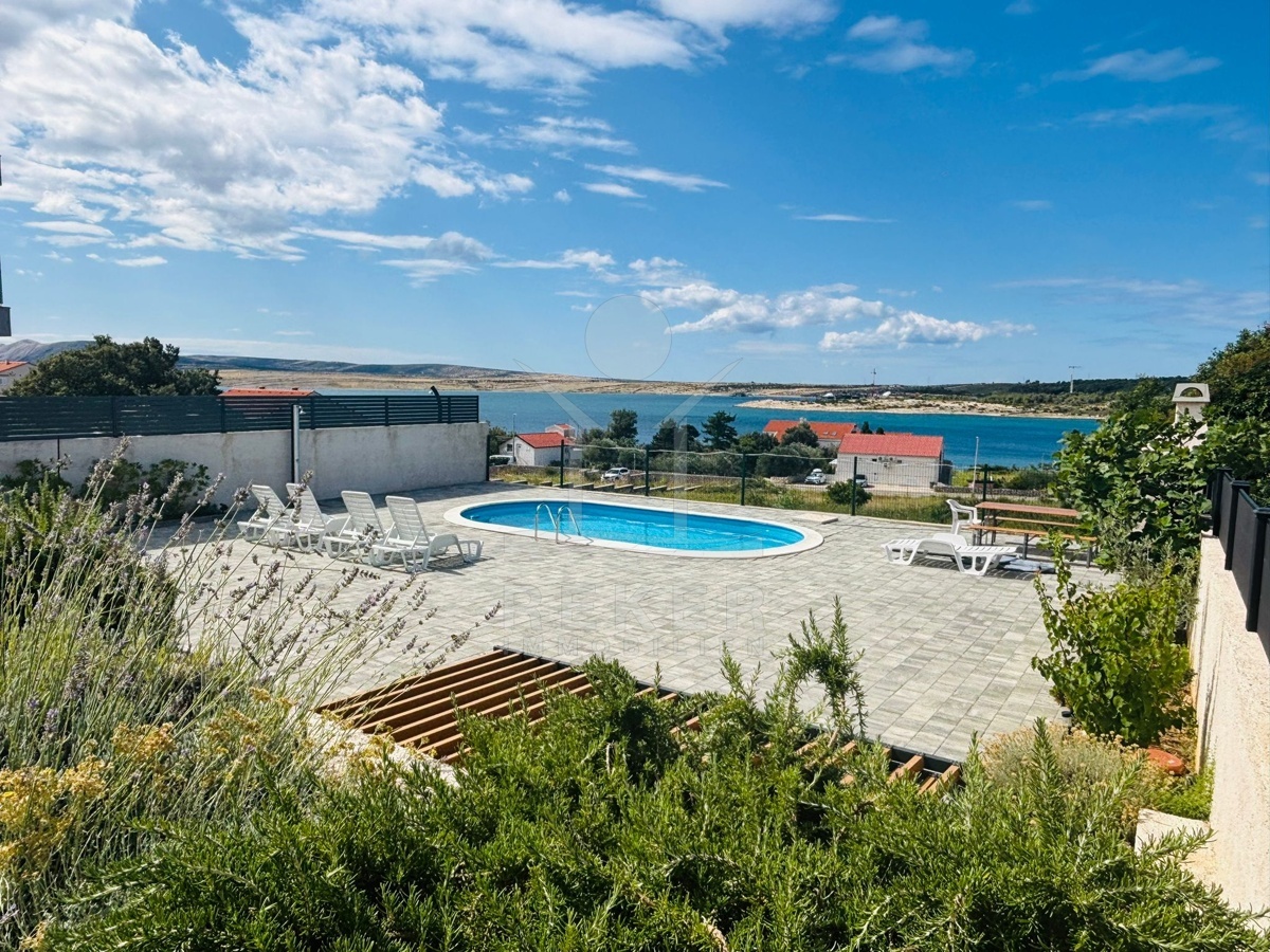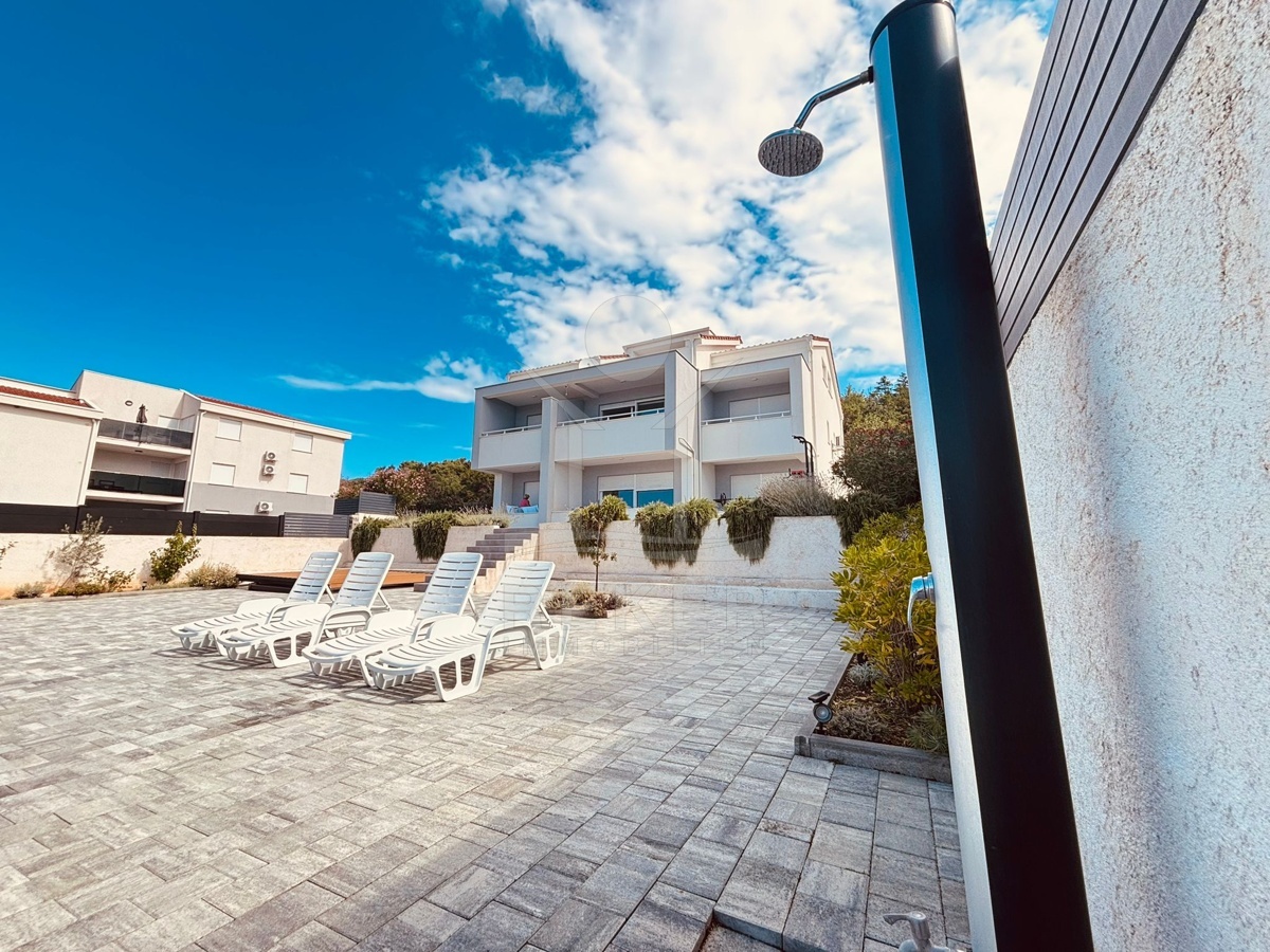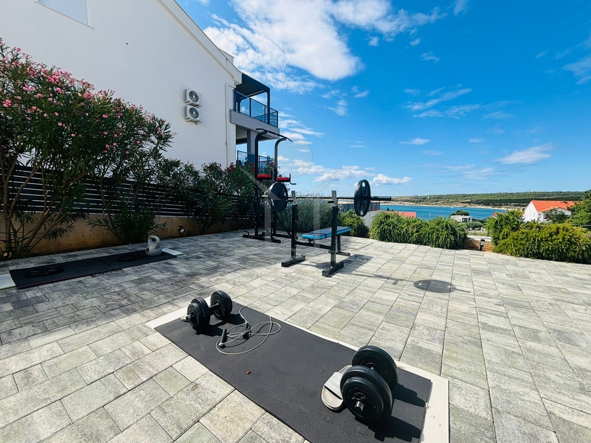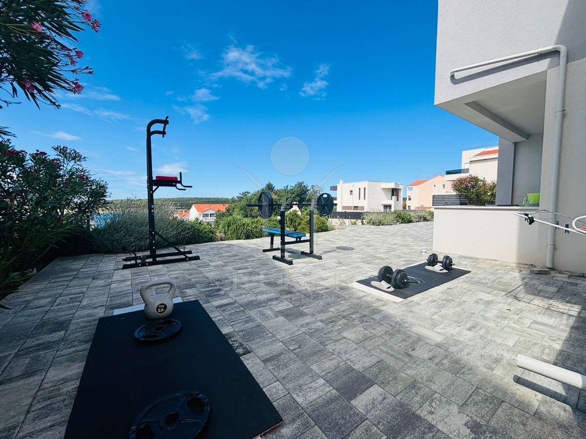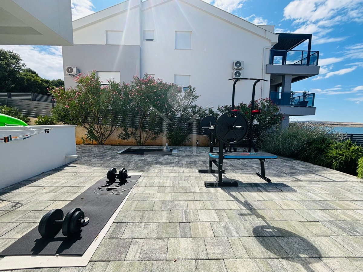 Das Grundstück umfasst 698 m². Es bietet reichlich Platz für das Leben im Freien. Ein Pool mit 20 m², dazu Sonnenterrasse, Liegewiese und Außendusche sorgen für echtes Urlaubsgefühl. Ergänzt wird der Außenbereich durch einen Steingrill und einen kleinen Fitnessbereich. Mehrere Terrassen öffnen den Blick auf die Bucht von Pag. Ein Panorama, das immer wieder fasziniert.