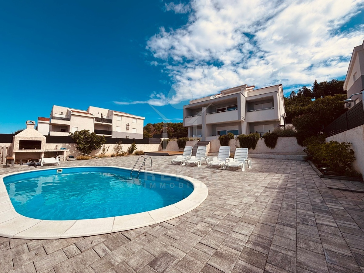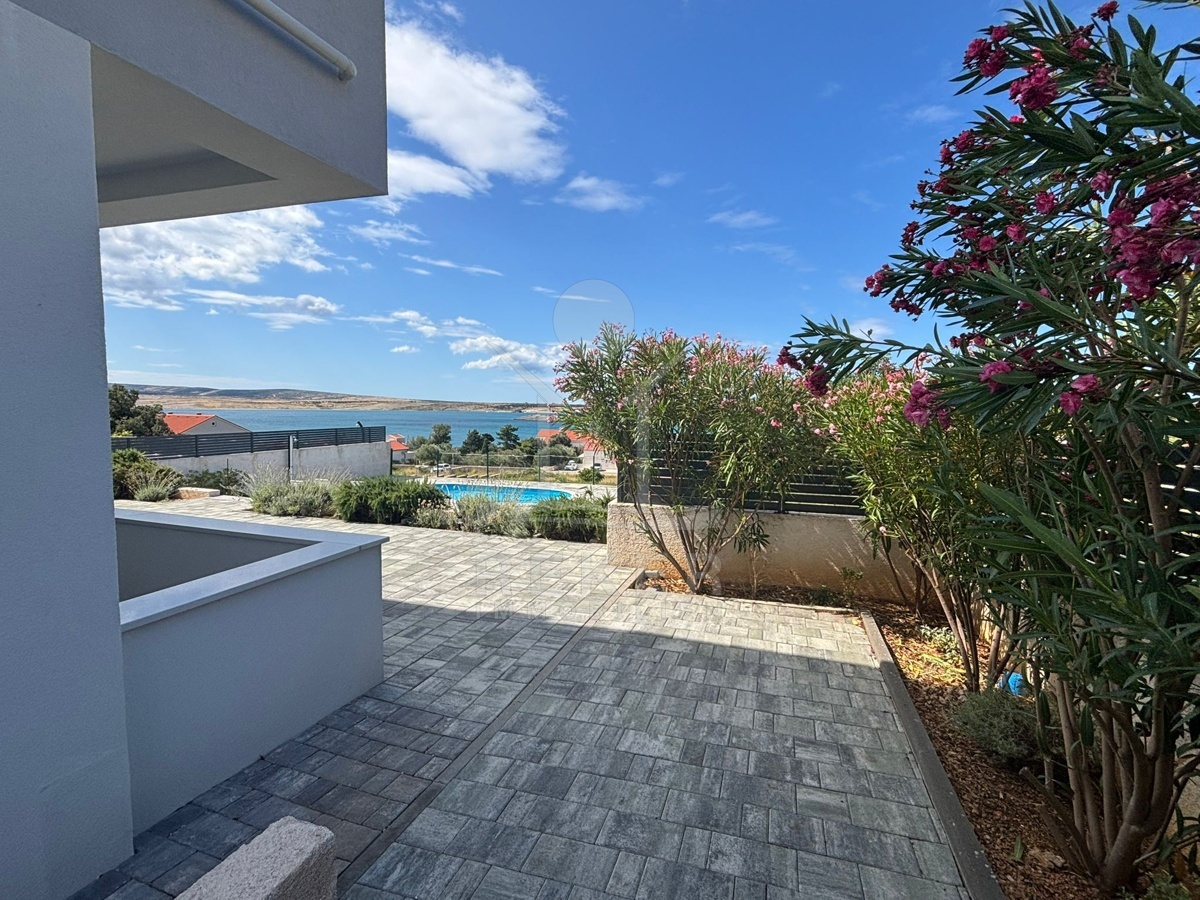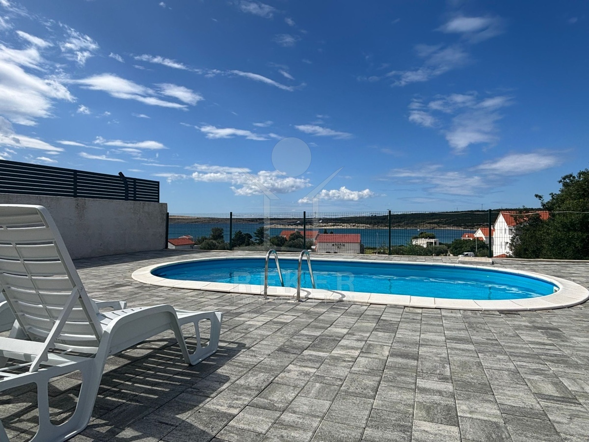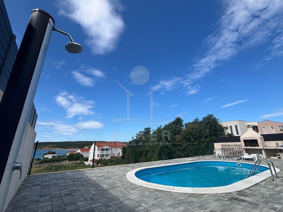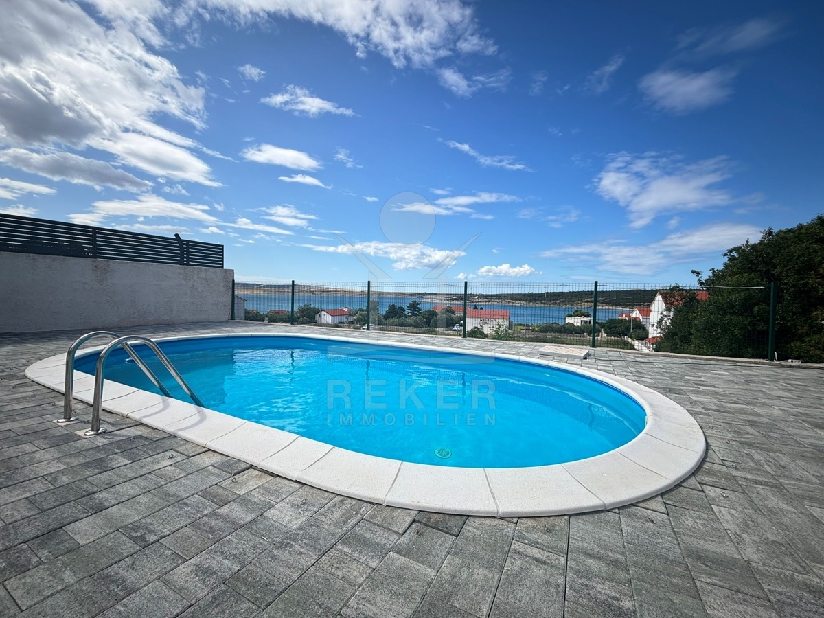 Das Grundstück umfasst 698 m². Es bietet reichlich Platz für das Leben im Freien. Ein Pool mit 20 m², dazu Sonnenterrasse, Liegewiese und Außendusche sorgen für echtes Urlaubsgefühl. Ergänzt wird der Außenbereich durch einen Steingrill und einen kleinen Fitnessbereich. Mehrere Terrassen öffnen den Blick auf die Bucht von Pag. Ein Panorama, das immer wieder fasziniert.