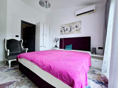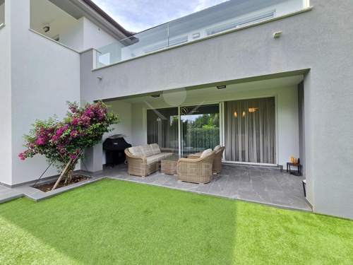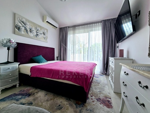 Im Inneren warten rund 180 m² Wohnfläche auf zwei Etagen. Im Erdgeschoss: offener Wohn- und Essbereich mit direktem Zugang zum Garten, moderne Küche und ein Schlafzimmer mit eigenem Bad. Im Obergeschoss: drei weitere Schlafzimmer, alle mit Bad und Zugang zur Loggia – hier reicht der Blick bis zum Meer. Fußbodenheizung mit Wärmepumpe, Klimaanlagen in allen Räumen, Glasfaser-Internet und hochwertige Möbel machen den Alltag angenehm. Auch eine Vorbereitung für die Ladestation eines E-Autos ist vorhanden.