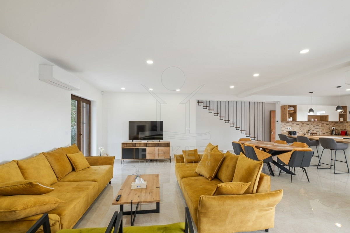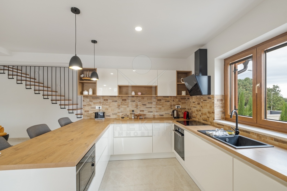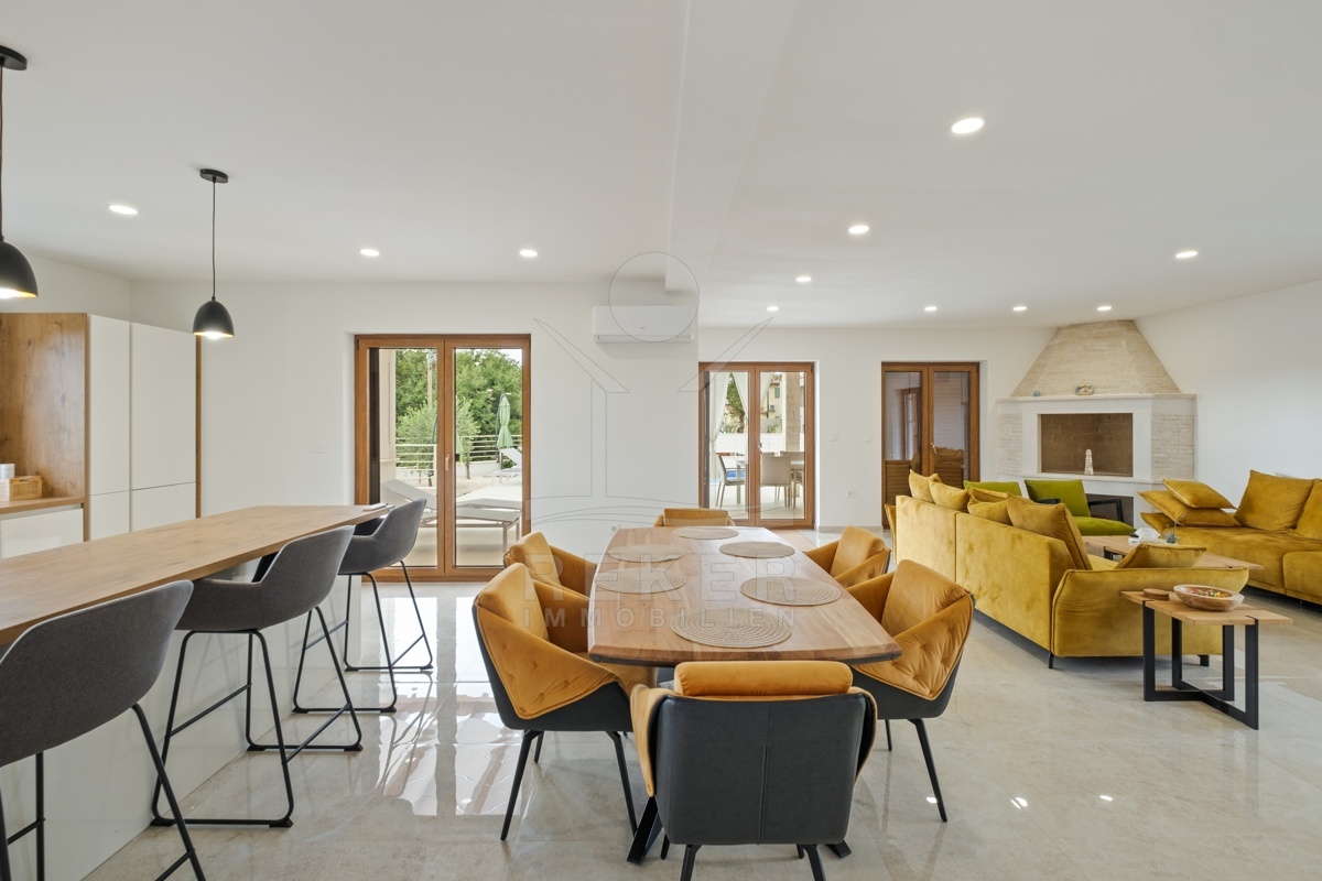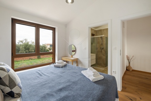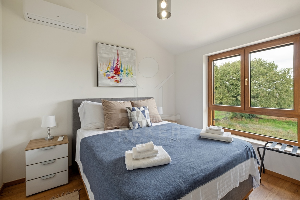 Dieses moderne Haus in Kavran, einem ruhigen Teil der Gemeinde Marčana, verbindet Komfort und Lage auf angenehme Weise. Nur 1,7 km trennen Sie vom Meer, rund 24 km von der historischen Stadt Pula. Die Umgebung ist ruhig und grün, zugleich erreichen Sie Restaurants, Sportanlagen und Einkaufsmöglichkeiten in wenigen Minuten. Drei Stellplätze befinden sich direkt vor dem Haus.