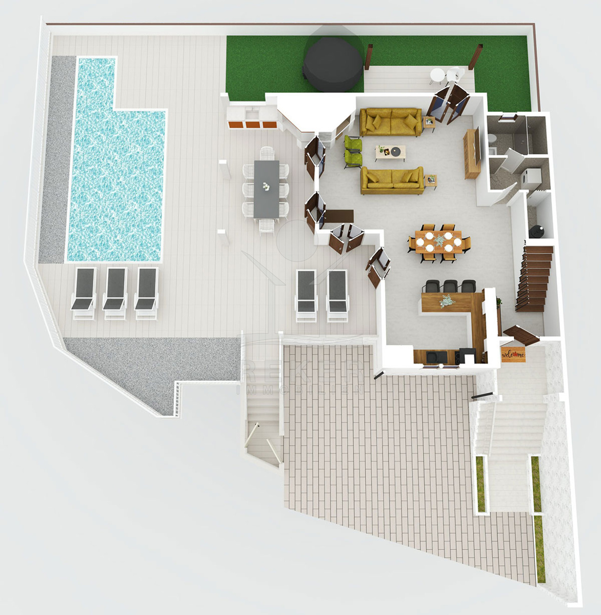 Das 363 m² große Grundstück präsentiert sich gepflegt. Ein 30 m² großer Salzwasserpool lädt an warmen Tagen zur Abkühlung ein. Dazu kommen ein kleiner Garten und eine 20 m² große Sommerküche, bestens geeignet für gesellige Stunden im Freien. Die Terrasse ist nach Südwesten ausgerichtet und bietet Sonne bis in die Abendstunden sowie einen schönen Blick in die Natur.