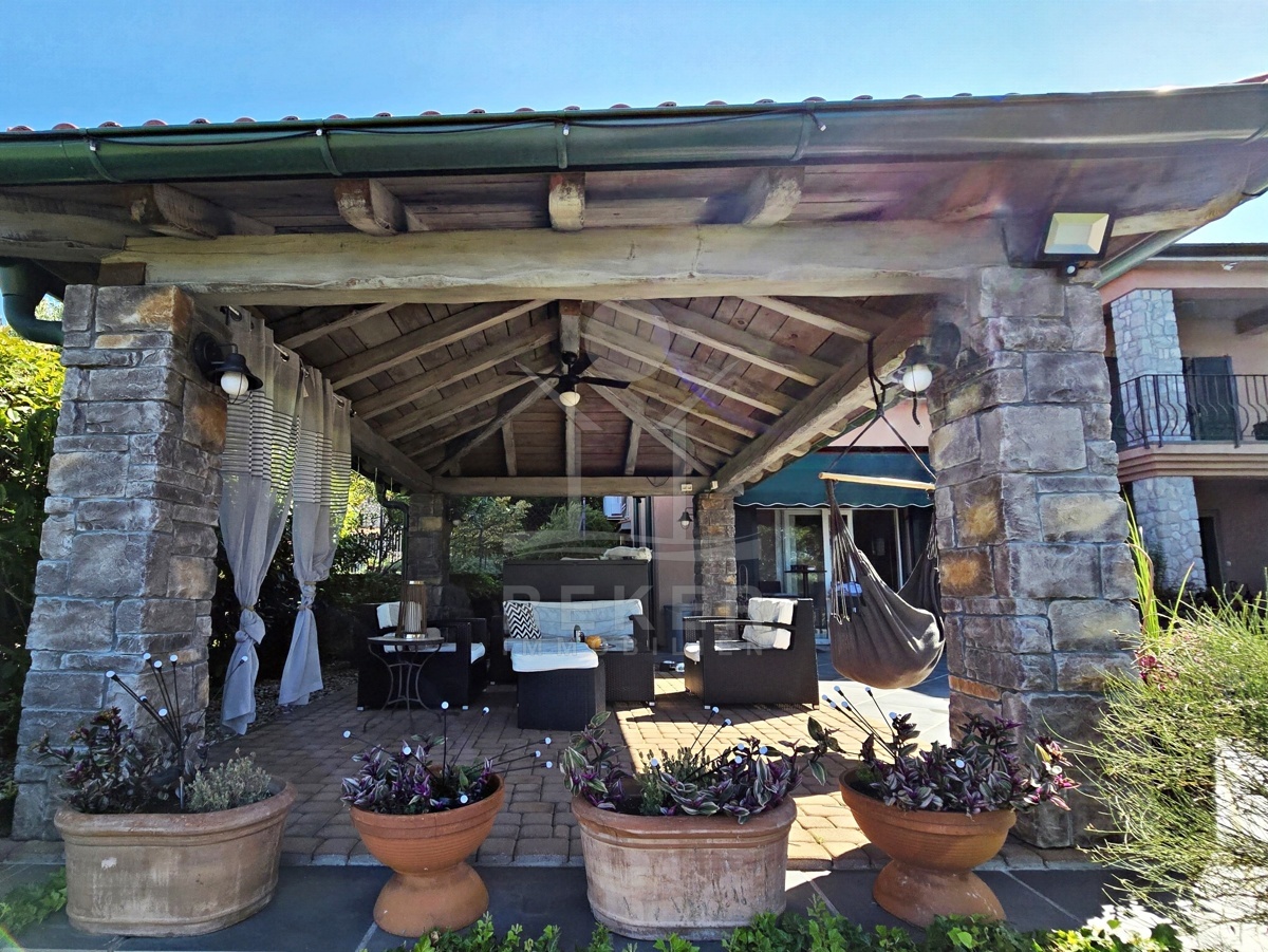 Der Garten ist ein echtes Highlight: Kaskadenförmig angelegt, mediterran bepflanzt, komplett mit Bewässerungssystem. In der Mitte liegt der 4 x 8 Meter große Pool – perfekt platziert, mit freiem Blick aufs Wasser. Gleich daneben eine charmante Sommerküche im massiven Natursteinpavillon. Dort verbringen Sie Ihre Abende. Entspannt, schattig, mit Grill und Esstisch. Und alles gut durchdacht: Von der Natursteintreppe bis zur kleinen Bank im Schatten des Feigenbaums. Das gesamte Grundstück ist alarmgesichert und gepflegt bis ins Detail.
