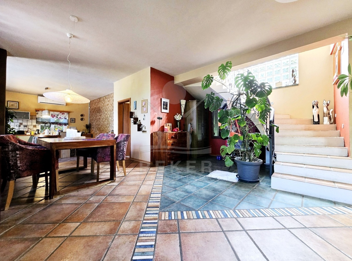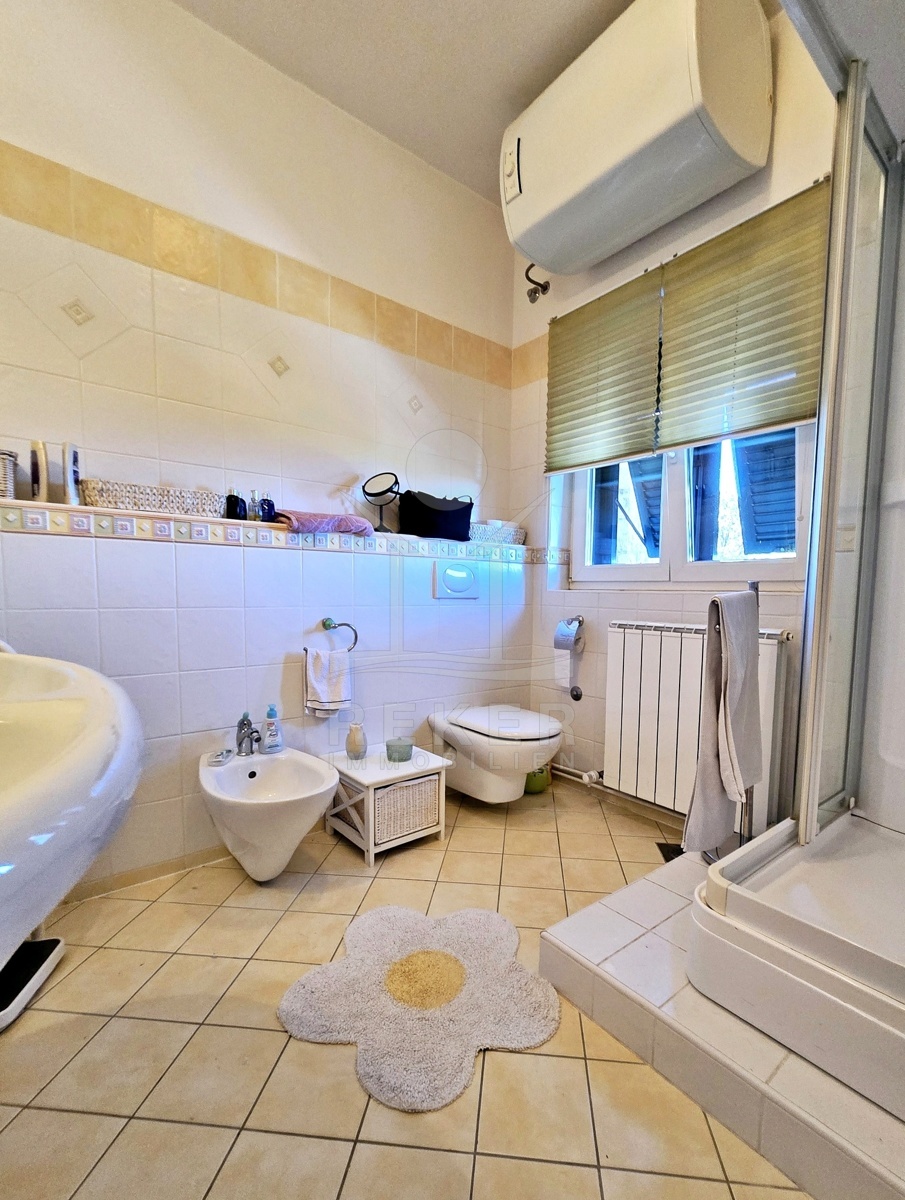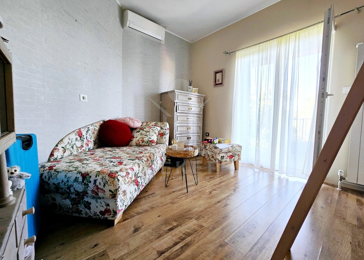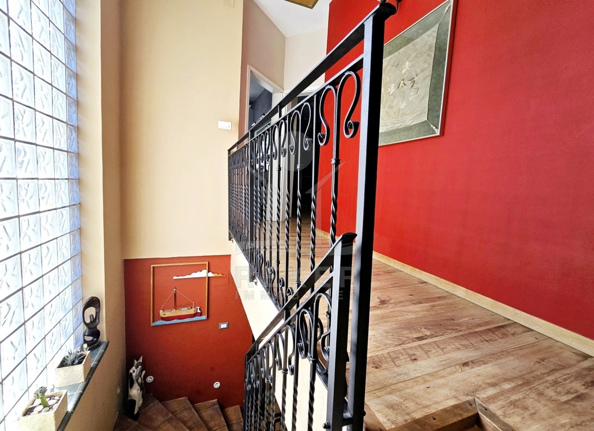 Im Inneren des Hauses beginnt das Wohnen auf 93 m² im Erdgeschoss. Der offene Wohnbereich vereint Küche, Essplatz und Wohnzimmer – großzügig, hell, mit einem schönen Mix aus rustikalen Elementen und moderner Technik. Die Küche ist komplett ausgestattet. Daneben sorgt ein stilvoller Kamin nicht nur für Gemütlichkeit, sondern auch für warme Luft in allen Räumen. Zusätzlich gibt es eine Gaszentralheizung und eine Klimaanlage. Eine halbrunde Innentreppe mit schmiedeeisernem Geländer führt nach oben. Dort wartet das Hauptschlafzimmer mit Loggia, eigenem Bad und begehbarem Kleiderschrank. Zwei weitere Schlafzimmer teilen sich ein zweites Bad. Eines davon mit Zugang zur überdachten Terrasse – mit Blick ins Grüne und bis zum Meer. Der Dachboden bietet zusätzlichen Stauraum.