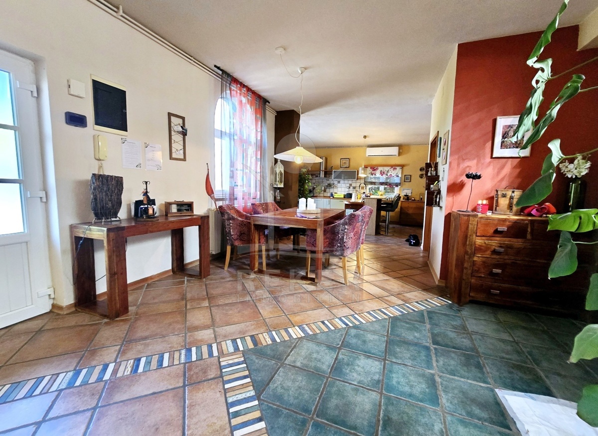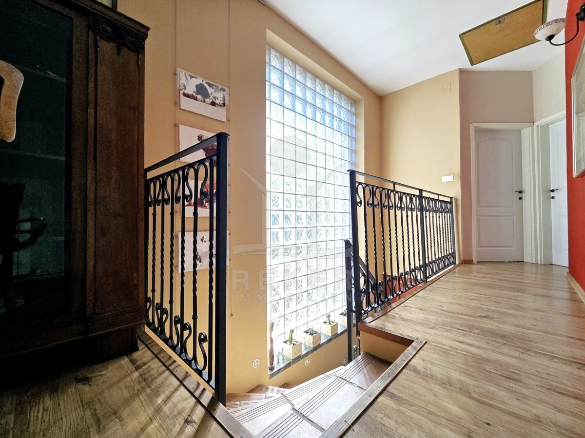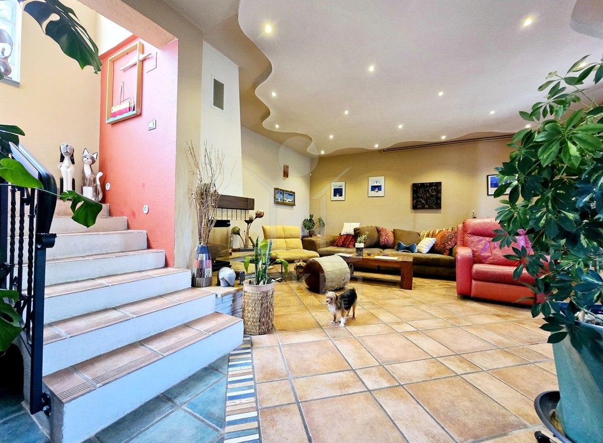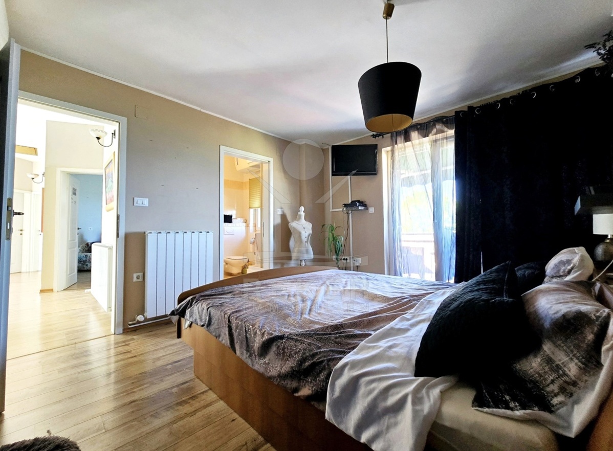 Im Inneren des Hauses beginnt das Wohnen auf 93 m² im Erdgeschoss. Der offene Wohnbereich vereint Küche, Essplatz und Wohnzimmer – großzügig, hell, mit einem schönen Mix aus rustikalen Elementen und moderner Technik. Die Küche ist komplett ausgestattet. Daneben sorgt ein stilvoller Kamin nicht nur für Gemütlichkeit, sondern auch für warme Luft in allen Räumen. Zusätzlich gibt es eine Gaszentralheizung und eine Klimaanlage. Eine halbrunde Innentreppe mit schmiedeeisernem Geländer führt nach oben. Dort wartet das Hauptschlafzimmer mit Loggia, eigenem Bad und begehbarem Kleiderschrank. Zwei weitere Schlafzimmer teilen sich ein zweites Bad. Eines davon mit Zugang zur überdachten Terrasse – mit Blick ins Grüne und bis zum Meer. Der Dachboden bietet zusätzlichen Stauraum.
