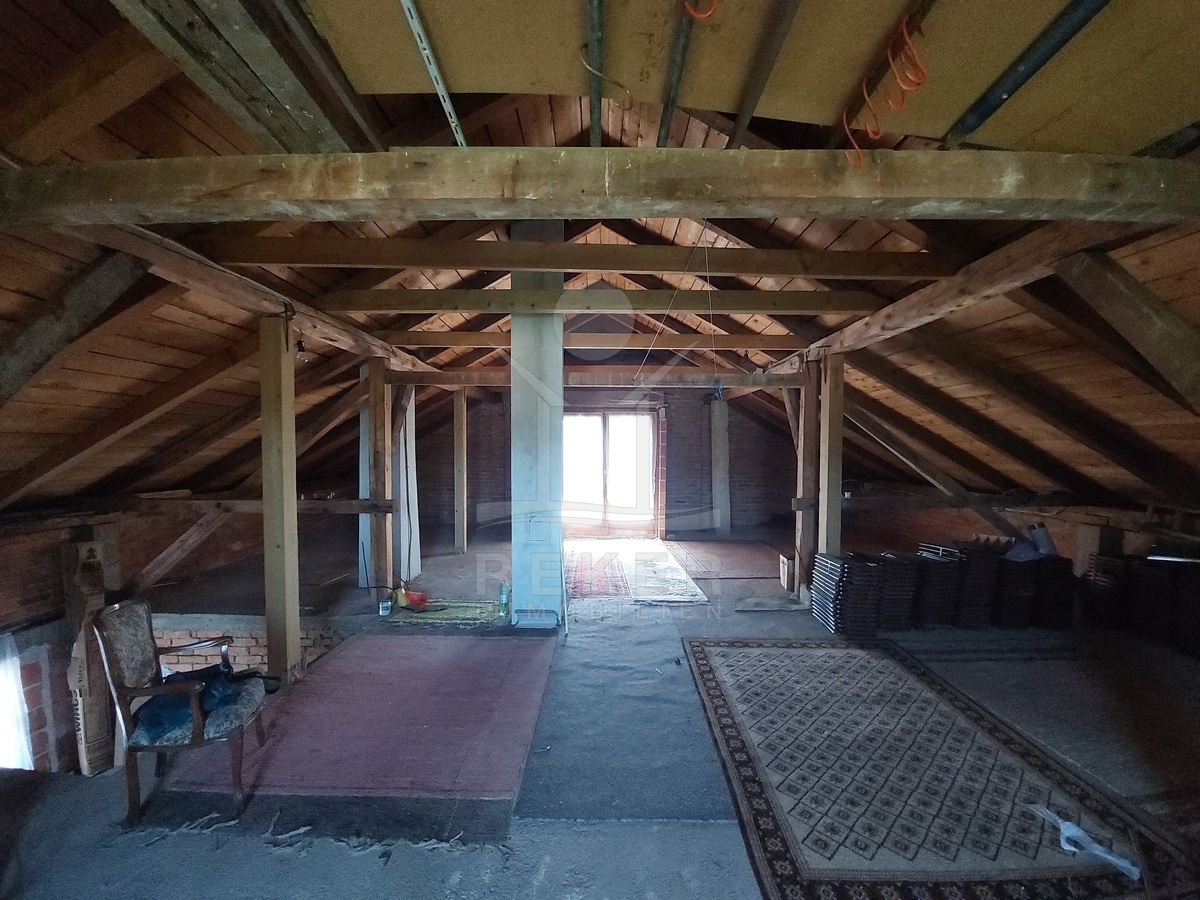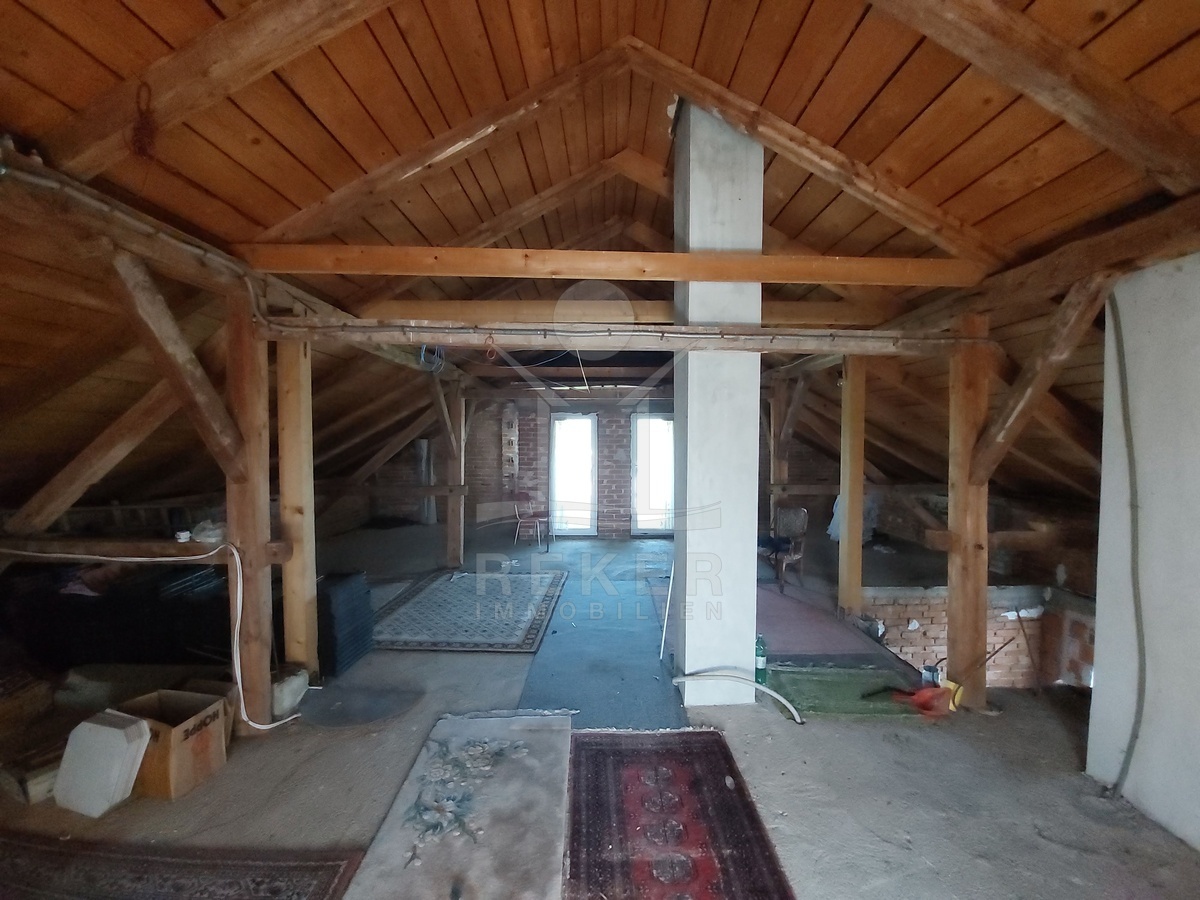 Im ersten Obergeschoss stehen ein Flur, ein Badezimmer und fünf Schlafzimmer zur Verfügung. Vier Zimmer bieten direkten Zugang zu einem L-förmigen Balkon. Das Dachgeschoss erreichen Sie über ein festes Treppenhaus. Es ist noch nicht ausgebaut, verfügt über zwei Loggien und bietet weiteres Ausbaupotenzial.