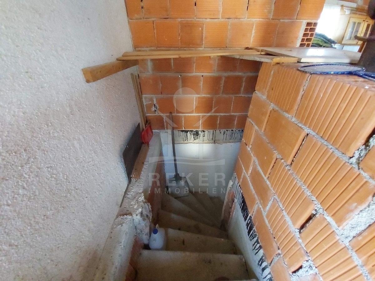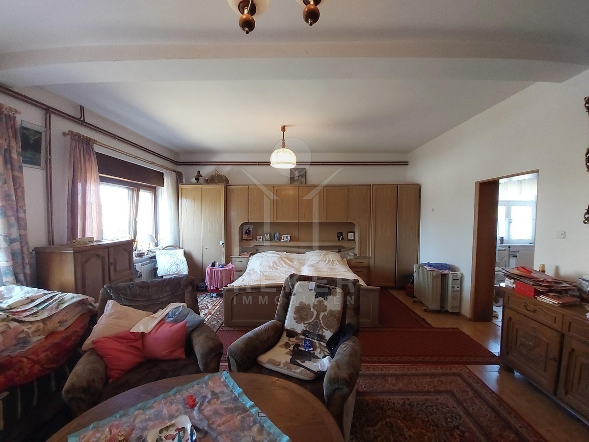 Der Wohnbereich verteilt sich auf mehrere Ebenen und bietet viel Platz. Im Erdgeschoss erwarten Sie ein Flur, ein großzügiges Wohnzimmer mit offener Küche sowie ein großes Schlafzimmer mit direktem Zugang zu einem geräumigen Badezimmer. Ergänzt wird diese Ebene durch zwei weitere Küchen, einen Abstellraum und einen Raum mit Vorbereitung für eine Zentralheizung.
