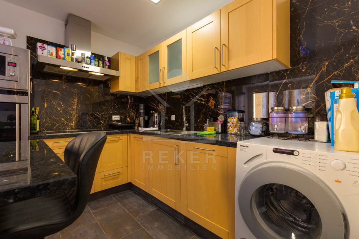 Die 50 m² große Terrasse ist ein echtes Highlight. Eine überdachte Sommerküche, Sitzbereich und Whirlpool schaffen hier den passenden Rahmen für mediterrane Abende. Mit Freunden oder allein. Zusätzlich wartet eine Dachterrasse, gut abgeschirmt und privat.