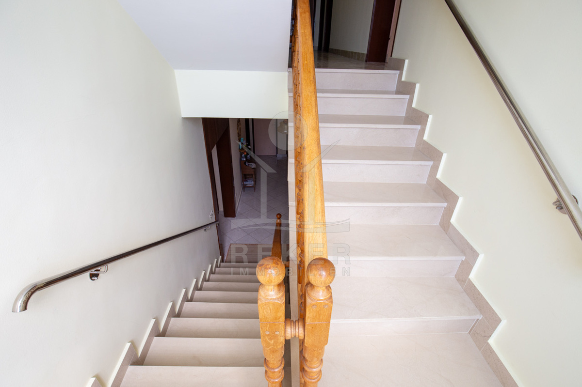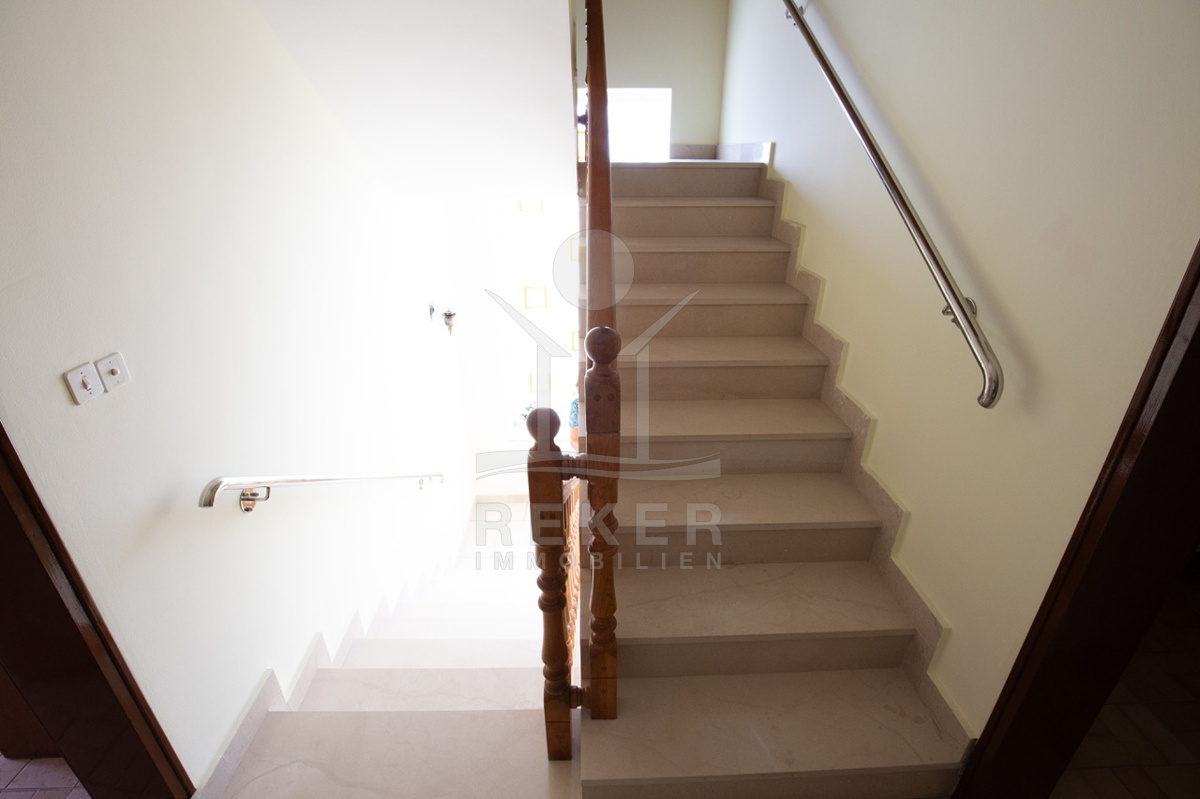 Im Inneren erwarten Sie 395 m² Wohnfläche auf drei Etagen. Das Erdgeschoss öffnet sich zu einem großzügigen Wohn- und Essbereich, ergänzt durch eine große Küche und den direkten Zugang zur Terrasse. Fünf Schlafzimmer und drei Badezimmer stehen bereit, fast alle mit Meerblick. Das Dachgeschoss mit normaler Stehhöhe bietet weiteres Ausbaupotenzial. Ein Keller ergänzt die nutzbaren Flächen. Möbel, Holzofen, Klimaanlage sowie städtische Versorgungs- und Abwasseranschlüsse sorgen für einen komfortablen Start.