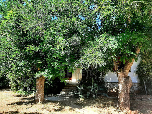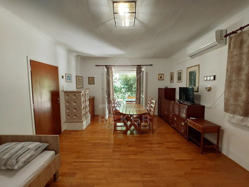 Der mediterrane Garten ist ein echtes Highlight. 405 m² reines Grün, voll eingewachsen, mit alten Bäumen, duftenden Pflanzen und Schattenplätzen. Zwischen den beiden Gebäuden öffnet sich der Außenbereich zu mehreren Terrassen – ideal zum Essen, Lesen, Spielen oder einfach nur Ausruhen. Die überdachte Terrasse mit Naturstein und Holzdecke liegt geschützt am Haus, angenehm kühl selbst im Hochsommer.