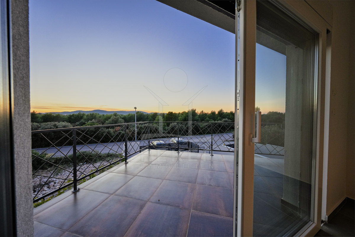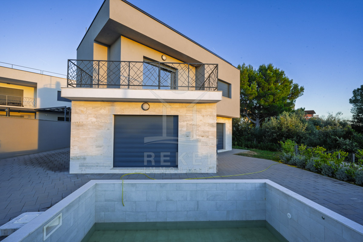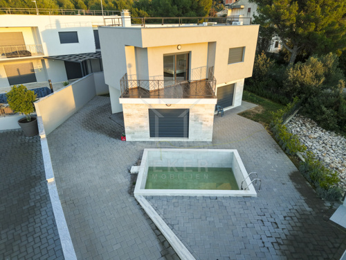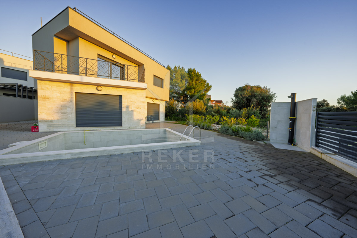 Diese moderne Villa in ruhiger, grüner Umgebung nahe Šibenik bietet alles, was man sich an der dalmatinischen Küste wünscht. Nur 500 Meter trennen Sie vom Meer. Das Grundstück mit rund 459 m² ist von einer Steinmauer umgeben und durch dichte Bepflanzung geschützt. Drei Parkplätze befinden sich vor dem Haus, im geschlossenen Hof stehen weitere Stellflächen bereit.