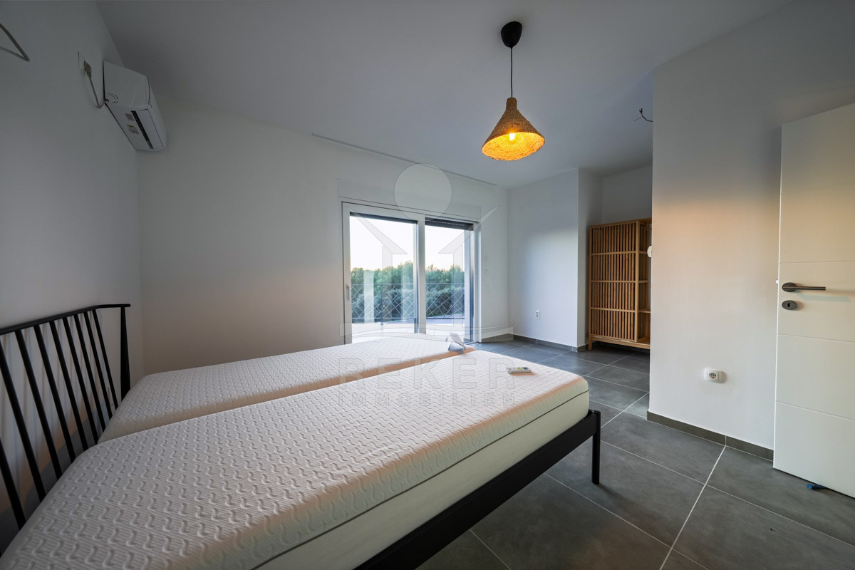 Innen erwartet Sie ein helles, modernes Ambiente mit klarer Architektur und praktischer Aufteilung. Im Erdgeschoss liegen der offene Wohn- und Essbereich mit Küche und Zugang zur Poolterrasse, ein Gäste-WC und ein Schlafzimmer mit eigenem Bad. Im Obergeschoss befinden sich drei weitere Schlafzimmer: eines mit privater Terrasse und Bad en suite, zwei mit gemeinsamer kleiner Terrasse und zusätzlichem Bad. Zwei Zimmer sind bereits möbliert, was einen schnellen Einzug ermöglicht.