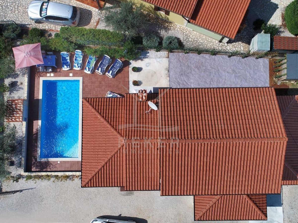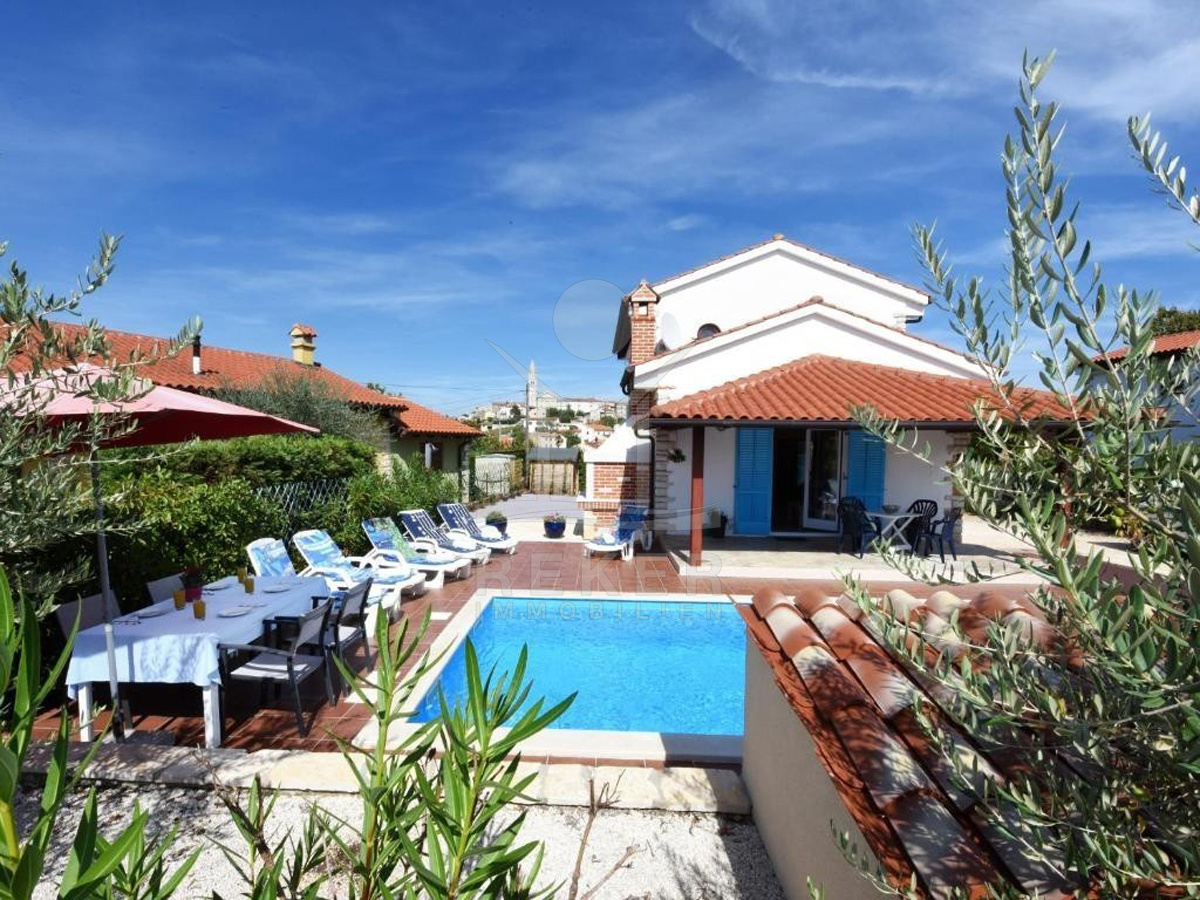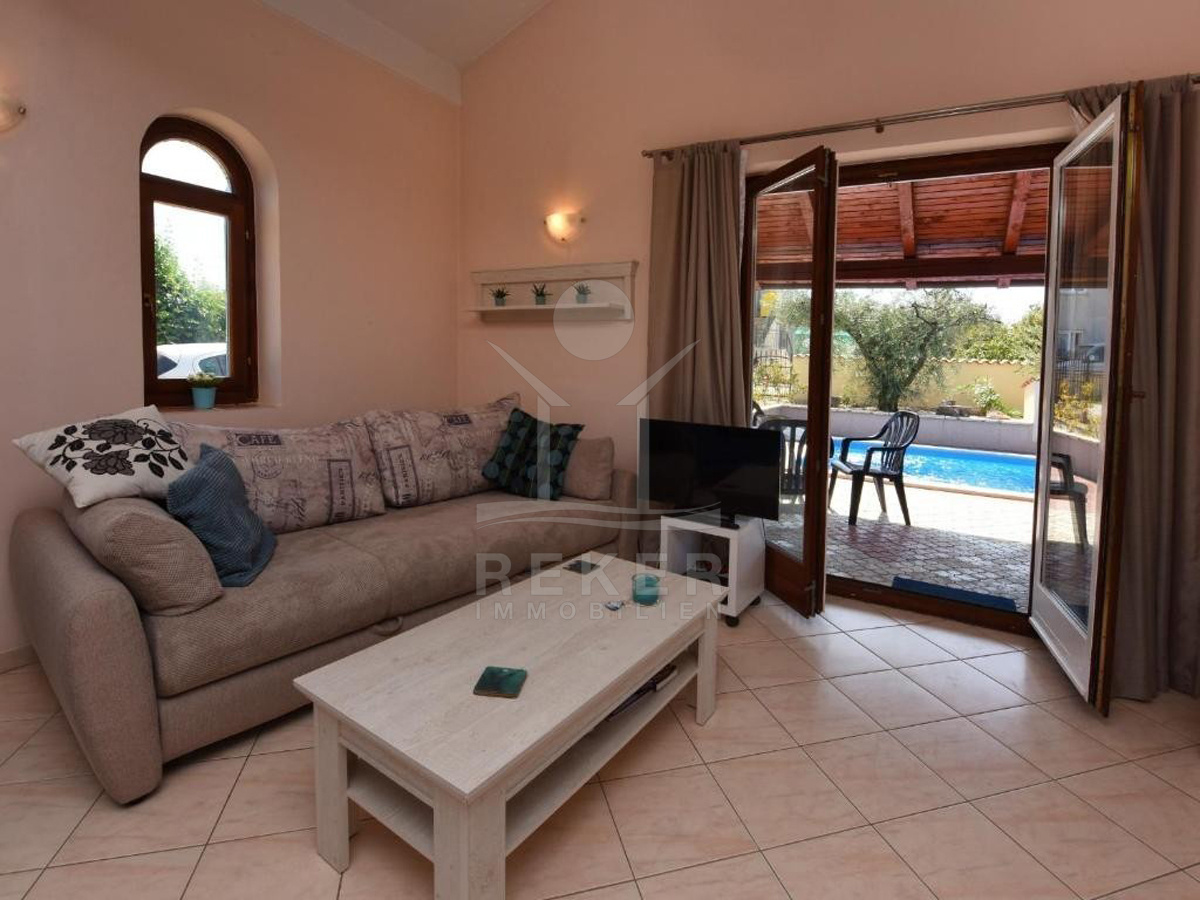 Nur 13 Kilometer von Poreč entfernt steht dieses freistehende Haus. Den nächsten Supermarkt und weitere Infrastruktur erreichen Sie nach etwa 1.500 Metern. Auf dem 550 m² großen Grundstück finden Sie mehrere Stellplätze, Ihr Auto steht also immer sicher. Der Garten strahlt mediterranes Flair aus und bietet viel Privatsphäre. Ein Pool mit gepflastertem Sonnenbereich lädt zum Entspannen ein. Dazu kommen ein gemauerter Grill und eine überdachte Terrasse mit Esstisch. Hier verbringen Sie gesellige Stunden mit Familie und Freunden.