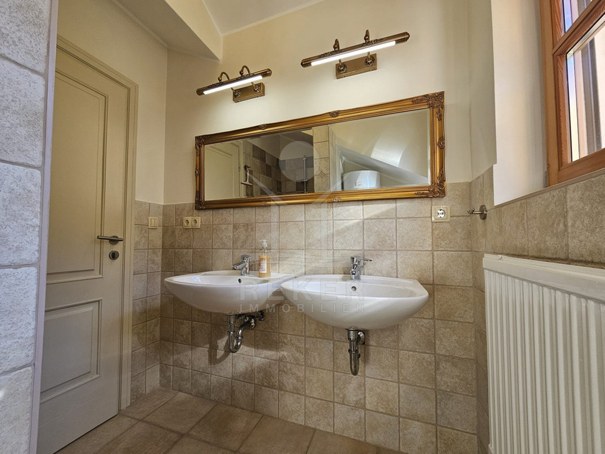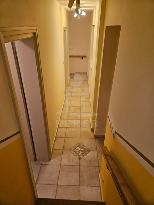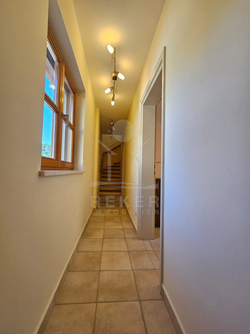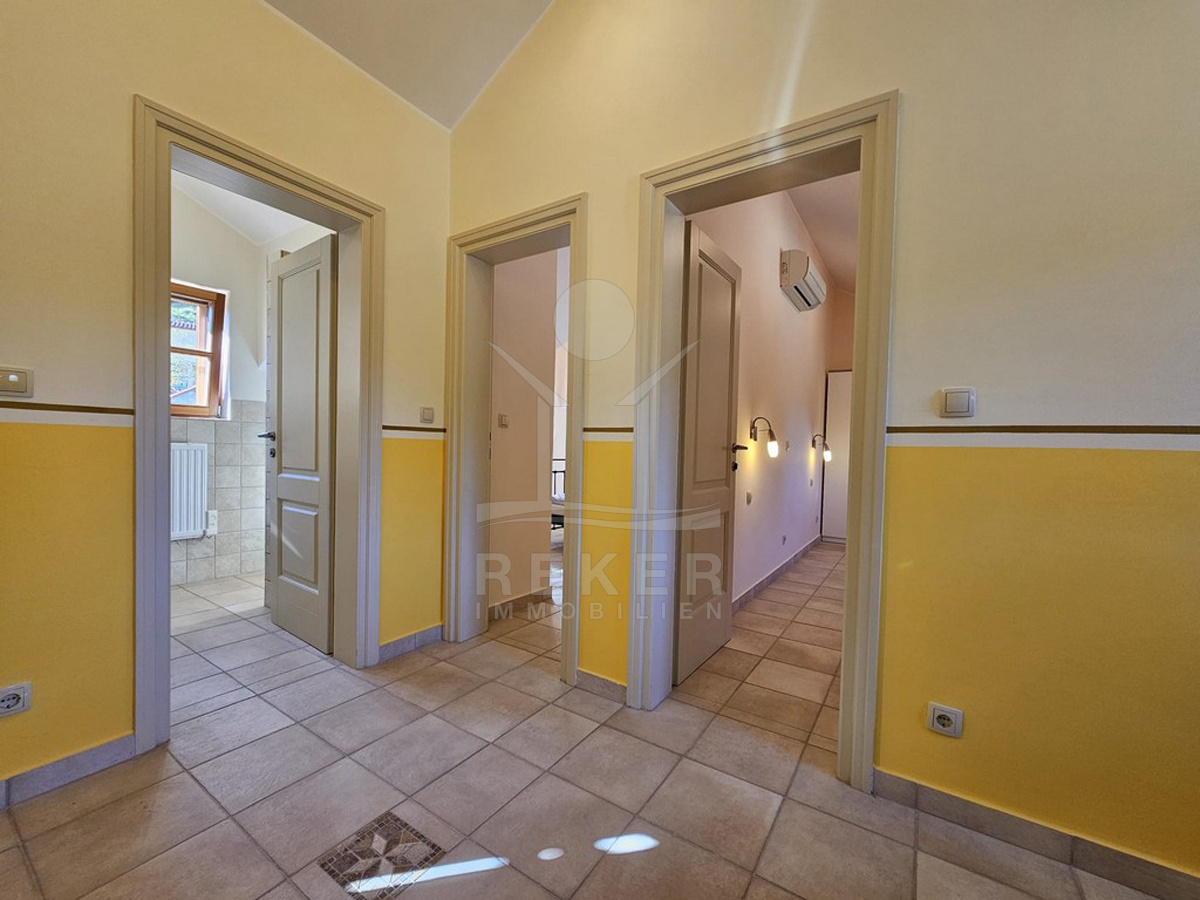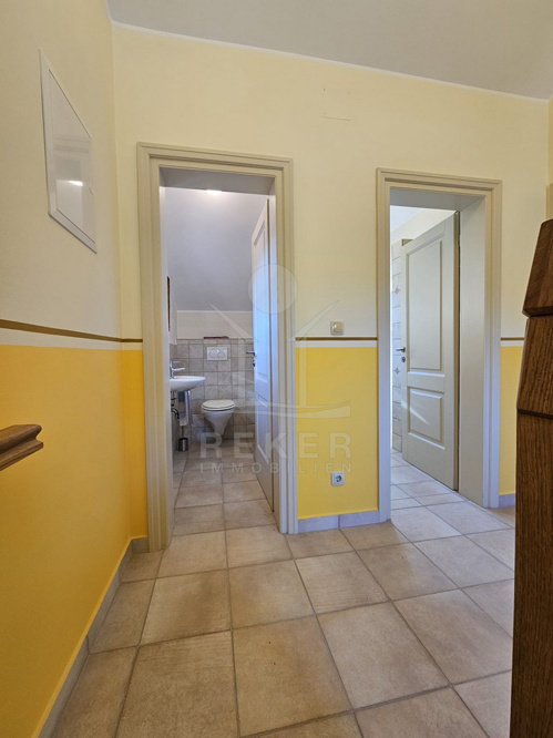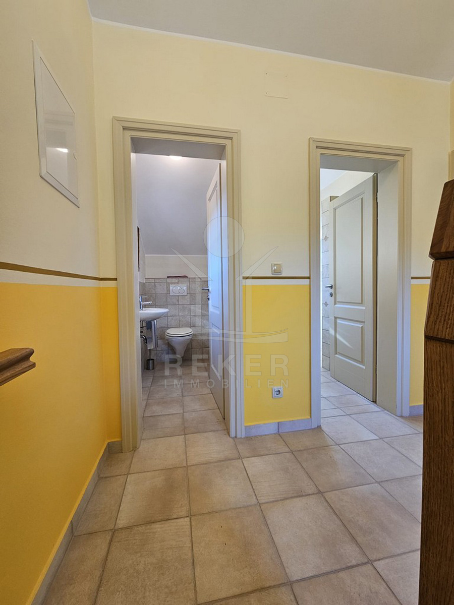 Die rund 150 m² Wohnfläche verteilen sich klar strukturiert auf drei Ebenen. Im Erdgeschoss erwarten Sie ein Flur, ein WC, eine Küche mit Essbereich und das Wohnzimmer. Von der Küche aus treten Sie direkt in den Hinterhof, kurze Wege im Alltag. Im ersten Obergeschoss befindet sich das Hauptschlafzimmer mit großem Badezimmer, separatem WC und Zugang zur Terrasse mit Blick auf den Hinterhof und Skradin. Im Dachgeschoss stehen zwei weitere Schlafzimmer, ein Badezimmer, ein WC sowie ein Flur mit integriertem Arbeitsbereich zur Verfügung.