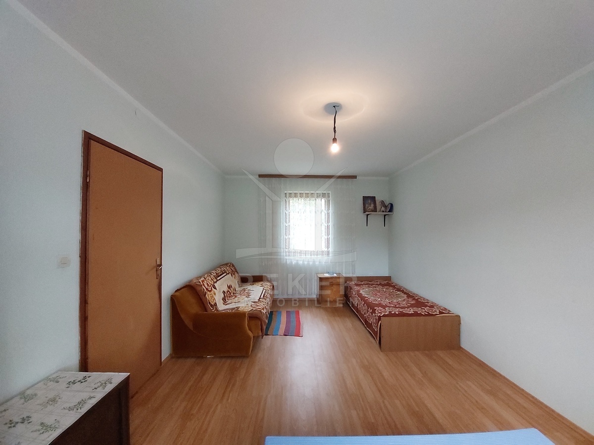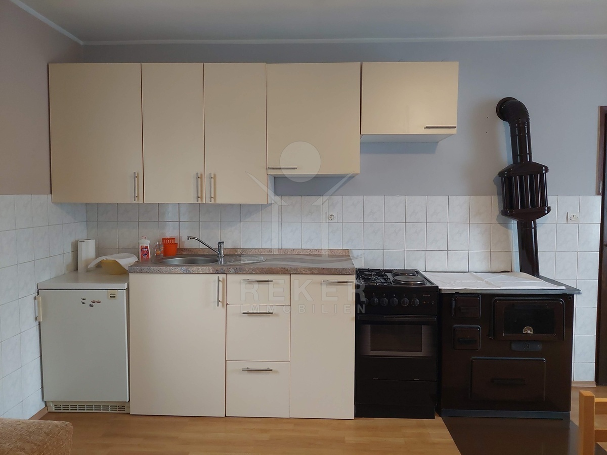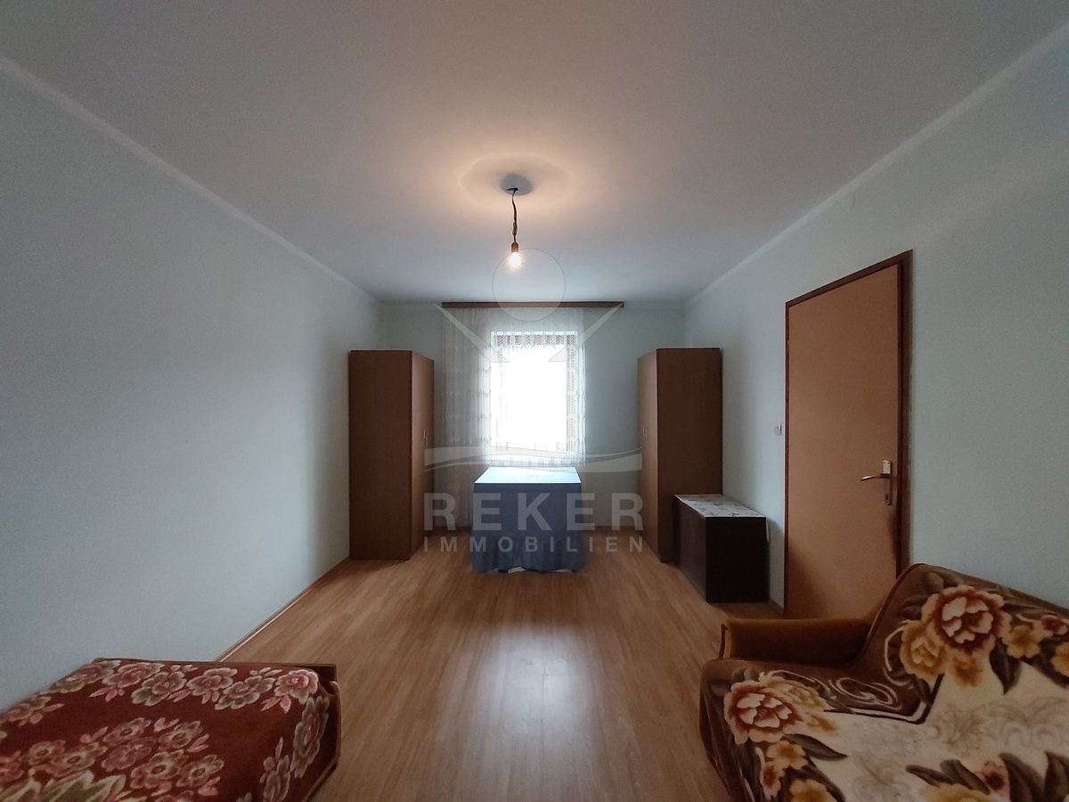 Das Wohnhaus bietet im Erdgeschoss rund 62 m² Wohnfläche sowie ein unausgebautes Dachgeschoss für zusätzlichen Gestaltungsspielraum. Im Erdgeschoss finden Sie Flur, Küche, Schlafzimmer und Badezimmer. Laminat- und Fliesenböden mit Dämmung, Holzfenster mit Doppelverglasung, Holztüren, Jalousien und ein Holzofen sorgen für ein wohnliches Ambiente. Warmwasser liefert ein elektrischer Boiler. Das Haus ist an das städtische Strom-, Wasser- und Abwassernetz angeschlossen und wird möbliert übergeben.