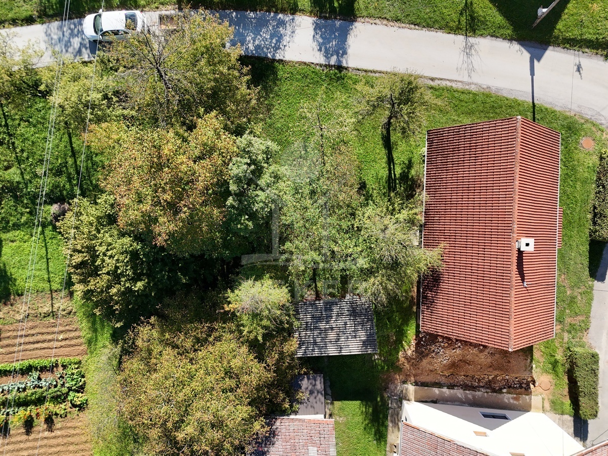 Das Anwesen besteht aus zwei Parzellen mit insgesamt 3.787 m² Fläche, beide vollständig in der Bauzone. Das bestehende Haus steht auf der vorderen Parzelle, die zweite grenzt direkt an und bietet viele Möglichkeiten, von Erweiterung über Neubau bis zur Gartengestaltung. Hinter dem Haus runden ein Holzschuppen und ein Obstgarten das Gesamtbild ab.