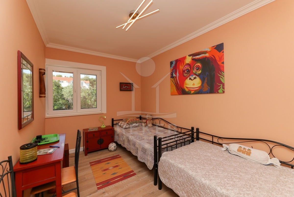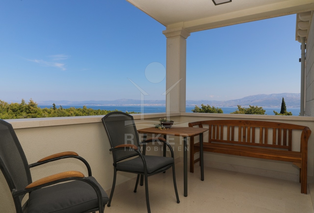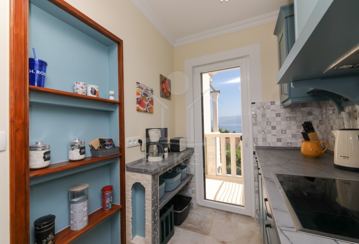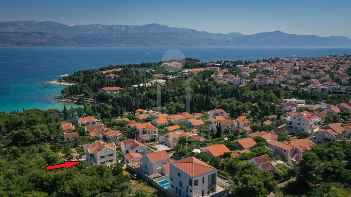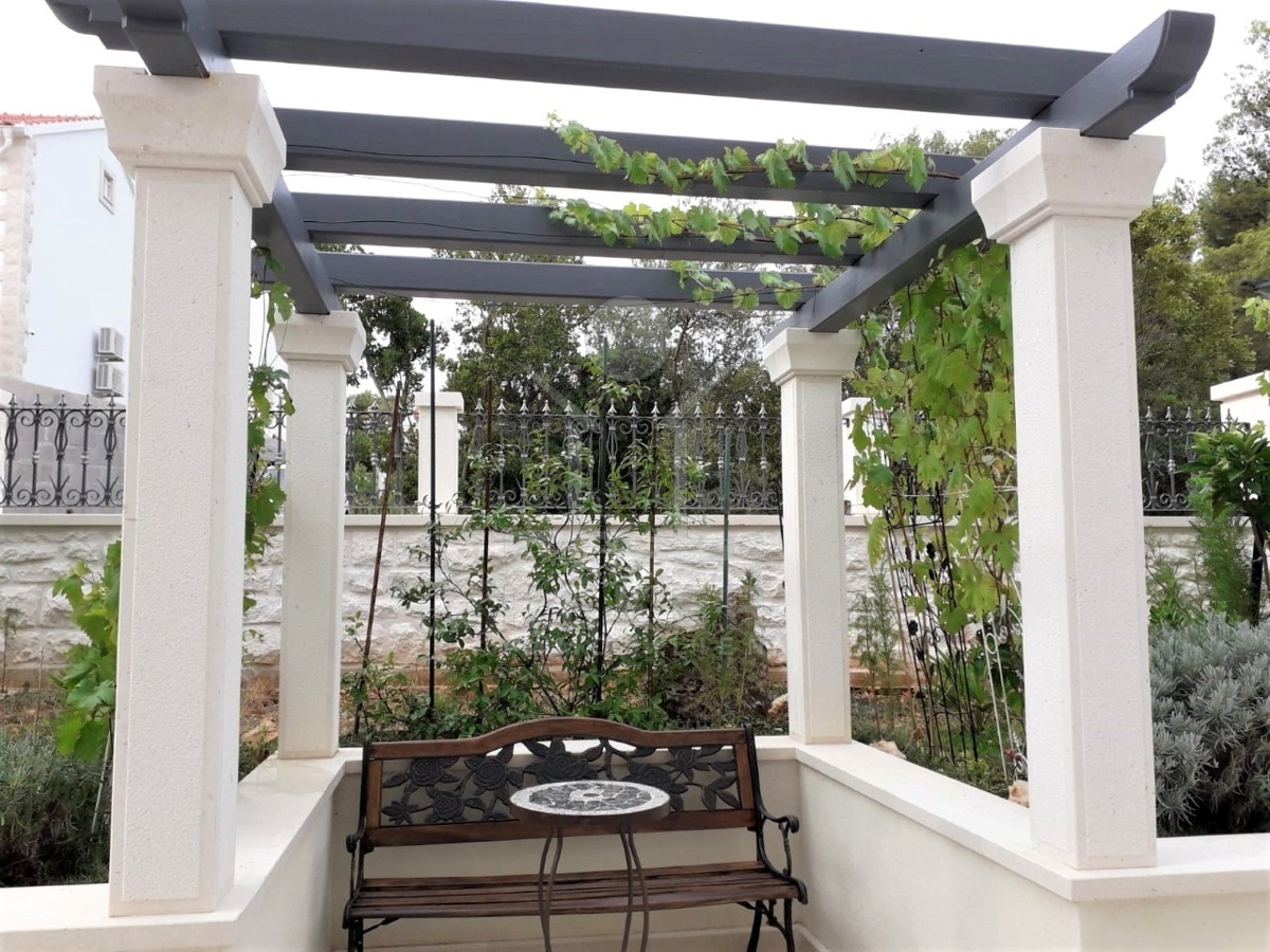 Auf dem Grundstück empfangen Sie mediterrane Aromen: Zitrusbäume, Oliven, gepflegte Pflanzen – bewässert automatisch. Der Garten ist nicht nur schön, sondern auch durchdacht. Ein gemauertes Gartenhaus steht bereit, und wenn Sie mögen, können Sie hier ganz einfach einen Pool anlegen – die Anschlüsse sind da. Zwei Fahrzeuge parken bequem auf dem Grundstück, das sicher umzäunt ist, mit elektrischem Tor. Das Haus selbst wurde aufwendig renoviert und mit Naturstein von der Insel Brač verkleidet – nicht nur ein Blickfang, sondern auch langlebig. Die Terrassen sind großzügig, teilweise überdacht, und bieten Privatsphäre sowie Meerblick in alle Richtungen.