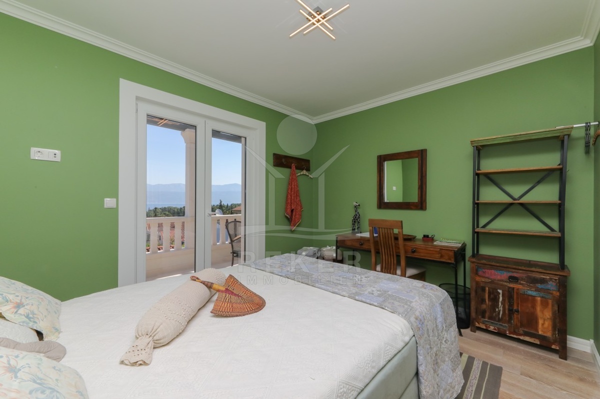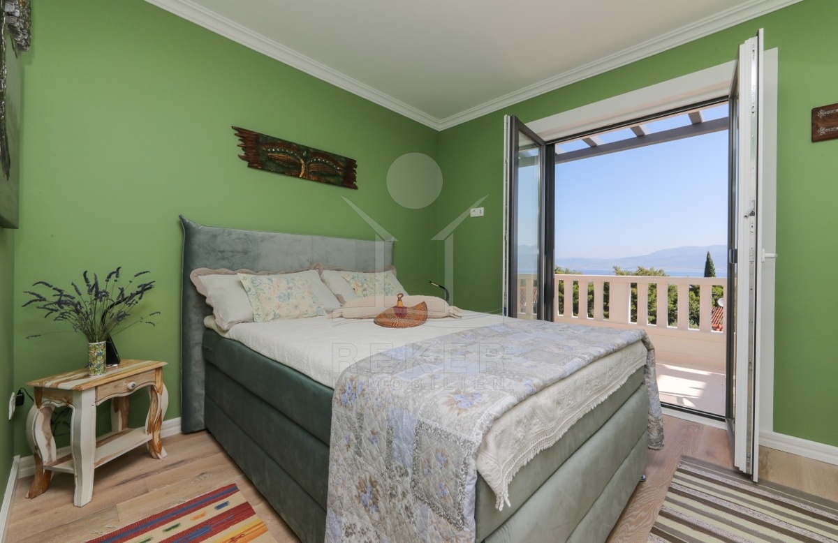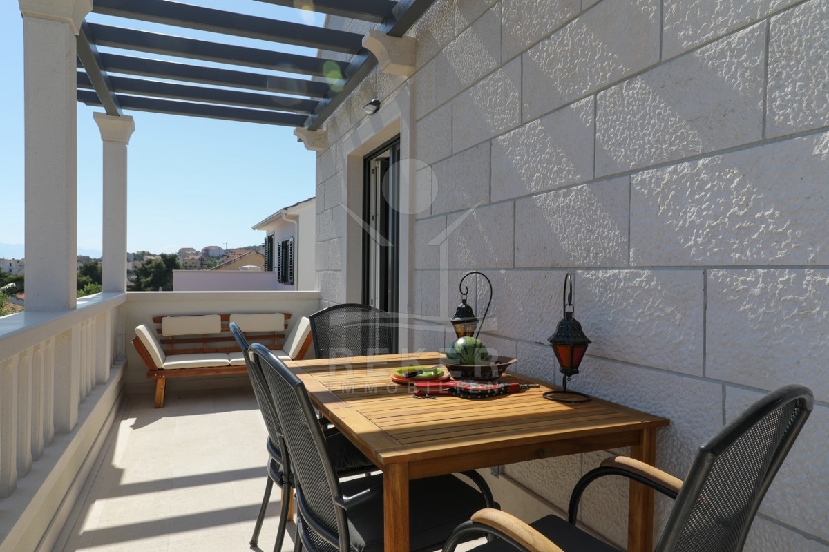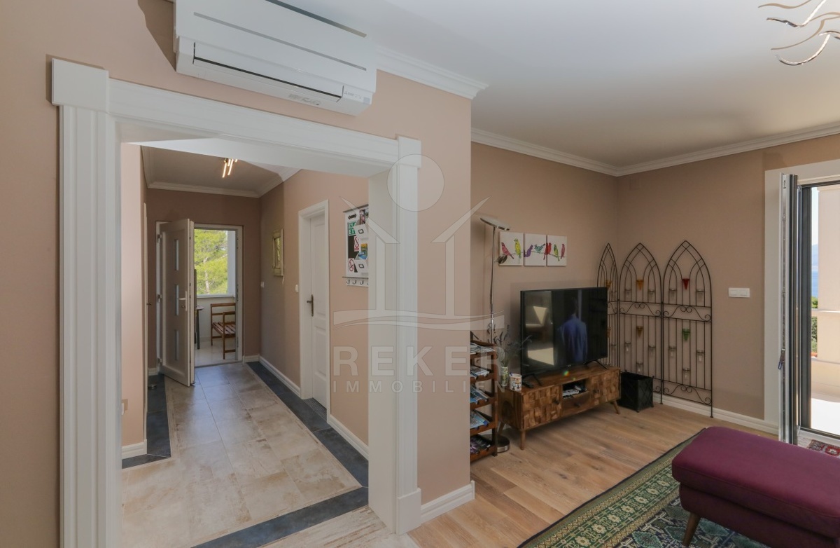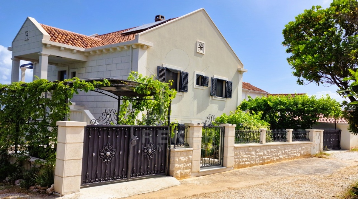 Auf dem Grundstück empfangen Sie mediterrane Aromen: Zitrusbäume, Oliven, gepflegte Pflanzen – bewässert automatisch. Der Garten ist nicht nur schön, sondern auch durchdacht. Ein gemauertes Gartenhaus steht bereit, und wenn Sie mögen, können Sie hier ganz einfach einen Pool anlegen – die Anschlüsse sind da. Zwei Fahrzeuge parken bequem auf dem Grundstück, das sicher umzäunt ist, mit elektrischem Tor. Das Haus selbst wurde aufwendig renoviert und mit Naturstein von der Insel Brač verkleidet – nicht nur ein Blickfang, sondern auch langlebig. Die Terrassen sind großzügig, teilweise überdacht, und bieten Privatsphäre sowie Meerblick in alle Richtungen.