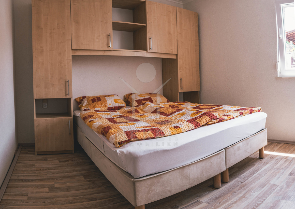 Haus 4 steht auf einem 322 m² großen Eckgrundstück und dient derzeit als Rezeption und Hausmeisterwohnung. Im Erdgeschoss befindet sich eine modern ausgestattete Sommerküche, im Obergeschoss ein Wohnbereich mit zwei Schlafzimmern und Bad. Der Hof bietet einen Abstellraum und einen Grillplatz. Ein solides Ensemble.