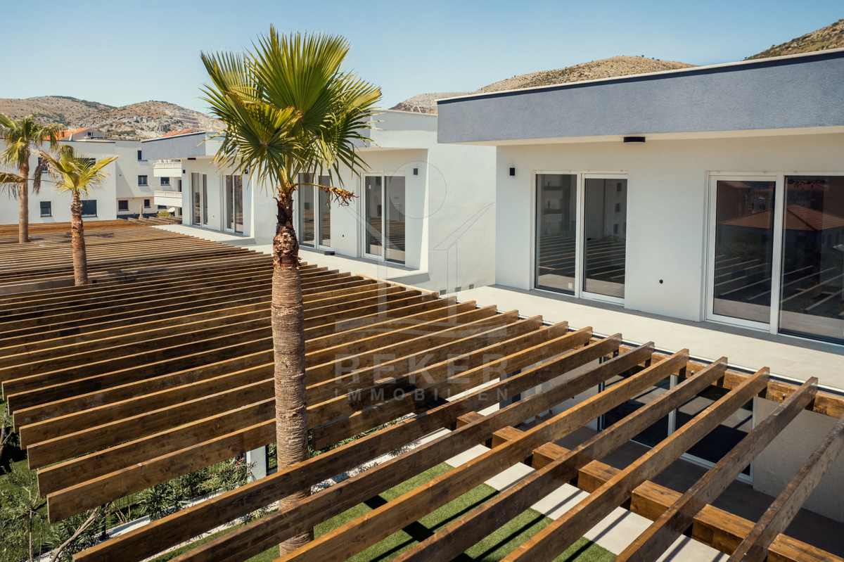 Der Neubau befindet sich in einer ruhigen und attraktiven Wohnregion von Trogir, umgeben von charmanten Einfamilienhäusern. Nur etwa 700 Meter vom Meer entfernt, ist der Zugang zur Küste und den schönen Stränden der Region mühelos. Die Altstadt von Trogir, die nur 600 Meter entfernt ist, verzaubert mit ihrer reichen Geschichte und dem UNESCO-Weltkulturerbe-Status. Hier können Sie durch enge, romantische Gassen schlendern und die beeindruckenden historischen Gebäude bewundern. Für den täglichen Bedarf finden Sie ein Geschäft in lediglich 200 Metern und eine Apotheke in 300 Metern Entfernung. Die erstklassige Lage bietet auch Zugang zu Schulen, Sportplätzen und einem lebhaften Fischmarkt, der nur 800 Meter entfernt ist. Zudem ist Trogir, nur 27 km von Split entfernt, ein beliebtes Ziel mit einer Vielzahl an Freizeitmöglichkeiten, die von Wassersport bis hin zu entspannten Strandtagen reichen. Abends laden die Restaurants und Konobas der Altstadt dazu ein, traditionelle mediterrane Küche in historischem Ambiente zu genießen, während die lebendige Uferpromenade zum Verweilen einlädt. Für Familien und Naturliebhaber bietet diese Umgebung das Beste aus beiden Welten - Ruhe und eine Vielzahl an Freizeitaktivitäten in einem einzigartigen historischen Setting.