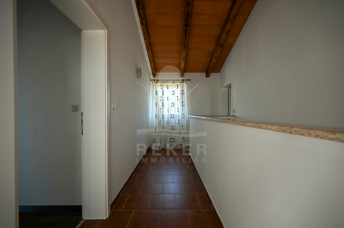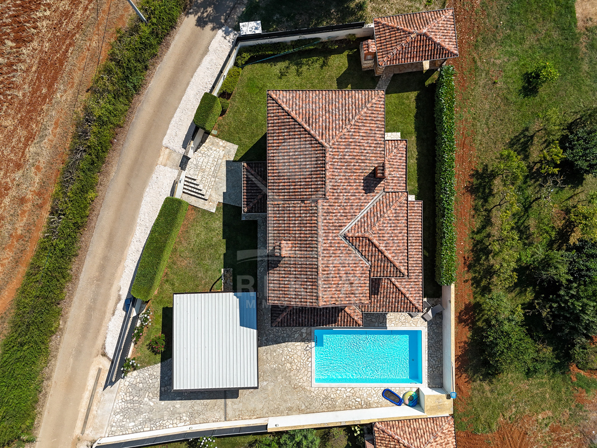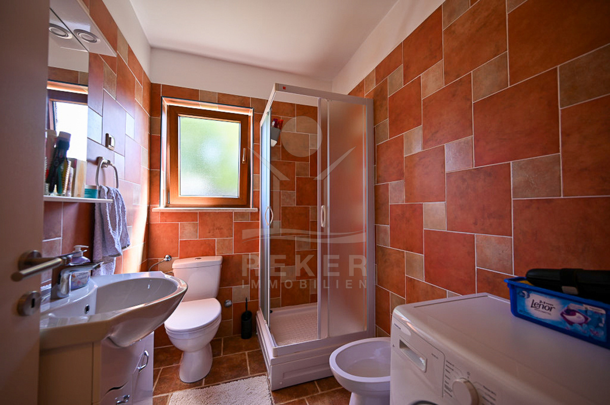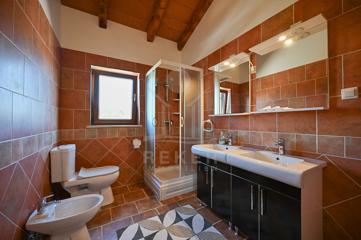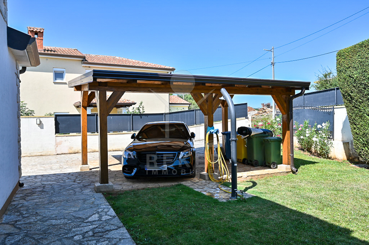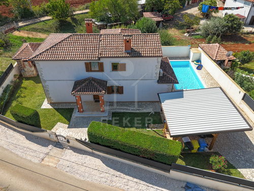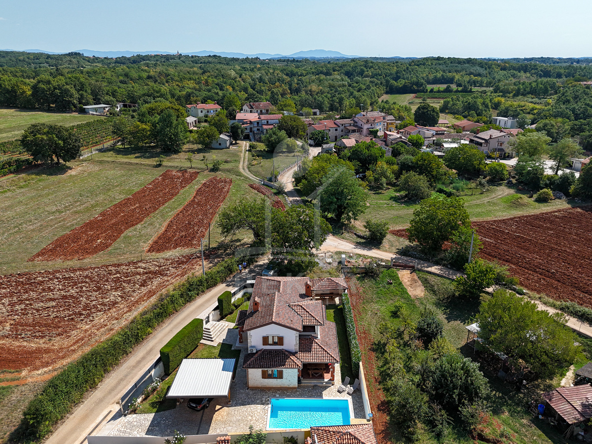 In Vižinada, einer malerischen Ortschaft im Herzen Istriens, steht dieses freistehende Steinhaus auf einem 620 m² großen Grundstück. Nur 10 km trennen Sie vom Meer, rund 15 km von der Küstenstadt Poreč. So genießen Sie Ruhe und Nähe zu allen wichtigen Einrichtungen. Der überdachte Parkplatz mit Platz für drei Fahrzeuge sorgt für Komfort und Sicherheit.